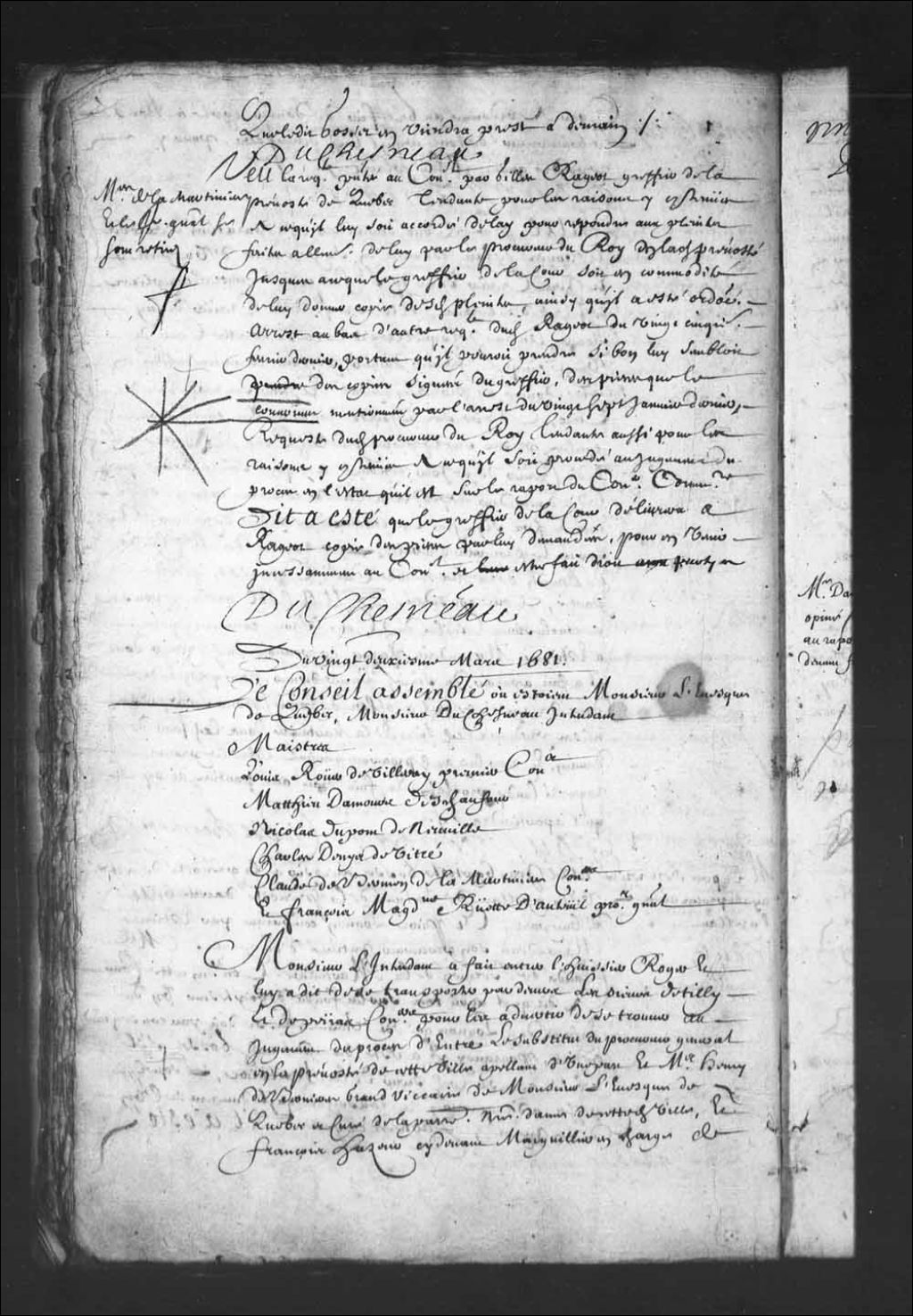 - Transcription du texte avec orthographe modernisée : «Du vingt-deuxième mars 1681. Le Conseil assemblé où étaient Monsieur l'évêque de Québec, Monsieur Duchesneau intendant. Maîtres. Louis Rouer de Villeray premier conseiller. Mathieu Damours Deschaufour. Nicolas Dupont de Neuville. Charles Denys de Vitré. Claude de Bermen de la Martinière conseillers. Et François Madeleine Ruette d'Auteuil procureur général. Monsieur l'intendant a fait entrer l'huissier Roger et lui a dit de se transporter par devers les sieurs de Tilly et Depeiras conseillers pour les avertir de se trouver au jugement du procès d'entre le substitut du procureur général en la prévôté de cette ville appelant d'une part et maître Henri de Bernières grand vicaire de Monsieur l'évêque de Québec et curé de la paroisse Notre-Dame de cette dite ville, et François Hazeur ci-devant marguillier en charge de l'oeuvre et fabrique de ladite paroisse d'autre parce que lesdits sieurs de Tilly et Depeiras ont été présents au rapport qui en a été fait avant ce jour par le conseiller commissaire et ledit huissier étant de retour, il a rapporté qu'ayant été à la maison dudit sieur de Tilly, il lui a été dit qu'il est absent et qu'on ne lui a pu dire où il était; et que ledit sieur Depeiras a été soigné ce matin et ne peut venir; et le greffier ayant été envoyé à Monsieur le gouverneur pour lui demander s'il avait agréable de se trouver au jugement dudit procès en ce qu'il a aussi été présent au rapport qui en a été fait, ledit greffier étant de retour a dit que mondit sieur le gouverneur lui avait dit qu'il priait la compagnie de l'en dispenser, ne le pouvant faire, étant actuellement à travailler a quelque affaire où ledit greffier l'a vu. DUCHESNEAU.»