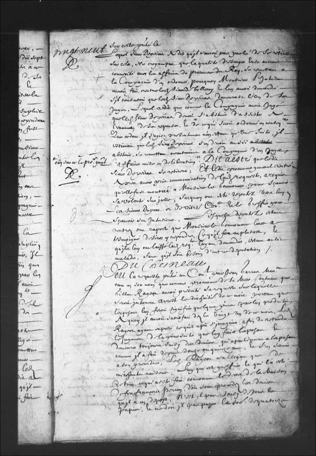 - Transcription du texte avec orthographe modernisée : «Vu la requête présentée au Conseil par Jean Garros marchand tant en son nom que comme procureur de sa mère, contenant que Gilles Rageot aurait présenté sa requête sur laquelle serait intervenu arrêt le dix-huitième de ce mois portant que l'exposant lui ferait signifier quelques pièces par lui produites, à quoi il aurait satisfait dès le vingt et un de ce mois, ledit Rageot ayant exposé ce qu'il a pu s'imaginer afin de retarder le jugement de la poursuite que lui fait l'exposant et demeure toujours saisi des deniers qui appartiennent à l'exposant comme il a fait depuis douze ou quinze ans, et s'en servir à son préjudice, ledit Rageot n'alléguant que de méchantes raisons; lui qui est greffier et qui l'a été de tout ce qui a été fait concernant le décret de la maison de feu François Perron, d'où sont procédés les deniers qu'il a en dépôt, n'est il pas saisi de tous les papiers, et ne doit il pas payer la somme de quatorze cent cinquante livres que l'exposant lui demande, ou faire voir ce qu'il en a fait, et montrer des sentences et des quittances s'il a fait des payements, car paraissant comme il fait qu'il en a été chargé, il est juste qu'il face voir qu'il en a été déchargé valablement, et c'est là toute la production qu'il devait faire, s'il en avait été en état. à ce qu'il plût au Conseil lui adjuger les fins et conclusions par lui prises contre ledit Rageot, le rapport de maître Charles Legardeur de Tilly conseiller dit a été que lui Rageot sera tenu de répondre à la signification qui lui a été faite à la requête de l'appelant pour en venir prêts et être fait droit au premier jour plaidable d'après Quasimodo, au rapport dudit commissaire. DUCHESNEAU.»