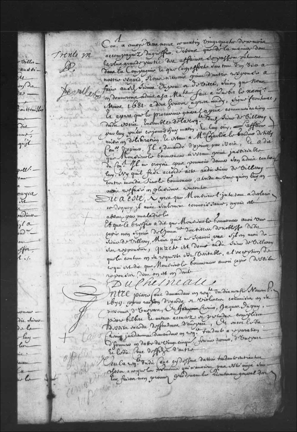 - Transcription du texte avec orthographe modernisée : «Entre Pierre COUC demandeur en requête du dix-neuvième novembre 1679 pour raison d'excès et violences commises en sa personne d'une part, et François CREVIER, Jacques DUPUY, Pierre GILBERT et autres accusés et prétendus complices desdits excès, défendeurs d'autre part, et encore ledit CREVIER incidemment demandeur en requête tendante à réparation d'honneur en date du vingt-cinquième février dernier, d'une part et ledit Couc défendeur d'autre. Vu la requête dudit COUC ci-dessus datée tendante entre autres choses à ce que les témoins qui n'avaient pas été ouïs sur les faits non prouvés par-devant le lieutenant général des Trois-Rivières, le fussent par-devant le conseiller commissaire et qu'elle fût communiquée au procureur général pour les frais de la poursuite, se réservant de prendre d'autres conclusions que celles par lui prises devant ledit lieutenant général, au bas de laquelle requête est le soit montré, et le réquisitoire dudit procureur général du même jour, arrêt de cette Cour du vingt et un dudit mois, interrogatoire dudit Dupuy des dix-sept février et vingt-cinq octobre audit au 1680. Autre interrogatoire dudit Gilbert du vingt-deuxième. Interrogatoire dudit Crevier du quatre mars ensuivant, information dudit jour quatrième mars, et des deux juillet, trois et quatre septembre et quinze octobre derniers, réquisitoire du huitième mars afin d'autre interrogatoire dudit Crevier, arrêt de cette dite Cour du treize du même mois de mars aux fins dudit réquisitoire, interrogatoire dudit Crevier du quatorze, autre arrêt du vingtième portant que les dénommés en icelui seraient assignés au vingtième juin ensuivant, réquisitoire du quatre juillet, arrêt du huitième du même mois au désir dudit réquisitoire; récolement et confrontation dudit Crevier de Noël Laurent, Jacques Brunet, Pierre Garros et Marie Gervais audit Crevier en date des quatorze mars, dix juillet, quinze et seize octobre, autre confrontation dudit Laurent audit Rattier du quinze mars, autre dudit Laurent audit Pierre Gilbert du même jour, autre confrontation dudit Brunel à Jean Rattier autre accusé du dixième juillet, autre dudit Garros audit Rattier du même jour, autre de Jacques Brunel audit Dupuy le lendemain, autre dudit Garros audit Dupuy dudit jour, interrogatoire desdits Rattier et Dupuy du vingt-cinquième octobre, arrêt de cette Cour du dernier décembre audit an, portant entre autres choses qu'avant faire droit sur la violence et excès prétendus commis contre ledit Couc par ledit Crevier et autres, le procès serait mis en état, requête dudit Couc afin d'avoir communication du procès pour y prendre des conclusions civiles, arrêt du dixième février dernier aux fins de ladite requête, requête dudit Crevier contenant entre autres choses des conclusions civiles par lui prises contre ledit Couc, au bas de laquelle il aurait été ordonné le vingt-cinquième février dernier qu'elle serait communiquée audit procureur général et par ses mains audit Couc, conclusions civiles prises au procès par ledit Couc contre lesdits accusés; réponses à icelles par Marandeau pour ledit Crevier auxquelles ledit Couc aurait déclaré n'avoir rien à dire que ce qu'il a demandé par sesdites conclusions civiles, conclusions du procureur général du neuvième du présent mois, le rapport de maître Claude de Bermen de la Martinière conseiller tout considéré. Dit a été que la Cour sans avoir égard aux conclusions prises par ledit Crevier pour les cas résultant du procès en ce qui regarde la voie de fait commise en la personne dudit Couc a condamné et condamne envers lui ledit Crevier en la somme de quatre cent quatre-vingt-dix livres d'intérêts civils, en dix livres d'amende envers le Roi et aux dépens de ce qui concerne ladite voie de fait à taxer par ledit commissaire sauf audit Crevier son recours contre qui il avisera bon être s'il y échoit, défenses à lui de récidiver sous telle peine qu'il appartiendra et audit Couc de lui faire aucuns reproches du meurtre commis en la personne de Jeanne Couc sa fille. DUCHESNEAU C. DE BERMEN»