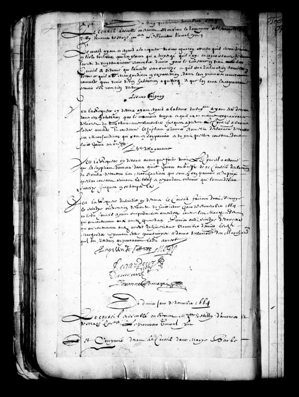 Transcription du texte avec orthographe modernisée : «Vu la requête du syndic ci-dessus le Conseil faisant droit renvoie le syndic à l'exécution de l'arrêt du huitième jour de novembre 1664 ou ledit Conseil ayant suspendu les amendes contre les marchands qui ont contrevenu aux arrêts précédents permis audit syndic de voir ceux qui ont contrevenu audit arrêt du huitième novembre dernier lesdits marchands ne pourront être poursuivis à donner déclaration des marchandises qu'ils ont vendues auparavant ledit arrêt. AUGUSTIN DE SAFFRAY MESY LEGARDEUR DE TILLY, DAMOURS PERONNE DEMAZÉ.»