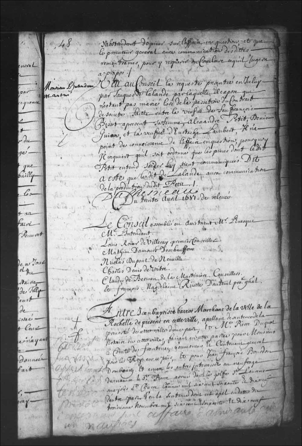 Arrêt ordonnant la communication à Jacques de Lalande, des pièces produites par Alexandre Petit, marchand, 30 avril 1681, Archives nationales à Québec, Fonds Conseil souverain, (03Q,TP1,S28,P2728).