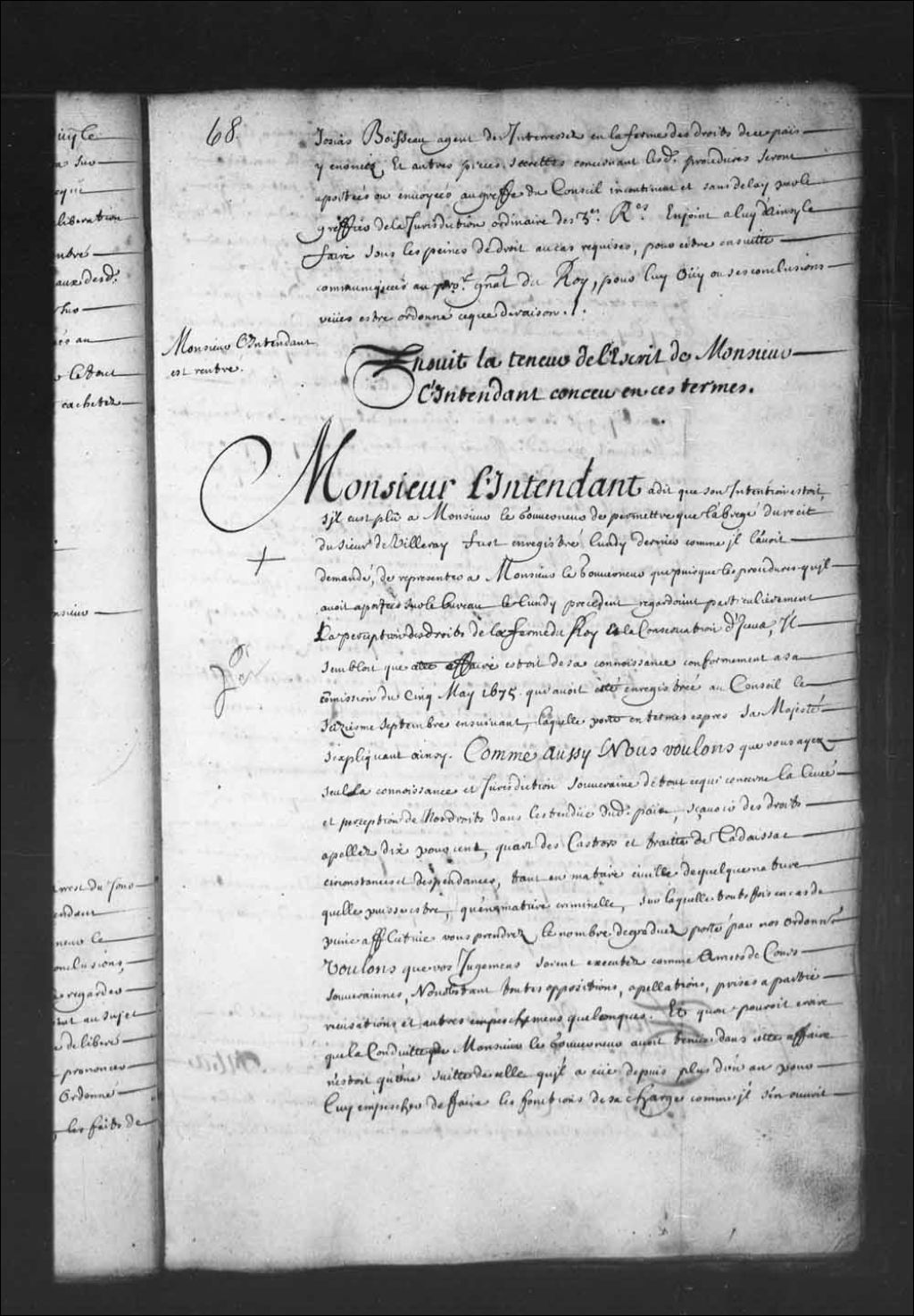 - Transcription du texte avec orthographe modernisée : «Ensuit la teneur de l'écrit de Monsieur l'intendant conçu en ces termes. Monsieur l'intendant a dit que son intention était, s'il eût plu à Monsieur le gouverneur de permettre que l'abrégé du récit du sieur de Villeray fut enregistré lundi dernier comme il l'avait demandé, de représenter à Monsieur le gouverneur que puisque les procédures qu'il avait apportées sur le bureau le lundi précédent regardaient particulièrement la perception des droits de la ferme du Roi et la conservation d'iceux, il semblait que cette affaire était de sa connaissance conformément à sa commission du cinq mai 1675 qui avait été enregistrée au Conseil le 16e septembre ensuivant, laquelle porte en termes exprès sa Majesté s'expliquant ainsi. Comme aussi nous voulons que vous ayez seul la connaissance et juridiction souveraine de tout ce qui concerne la levée et perception de nos droits dans l'étendue dudit [...]