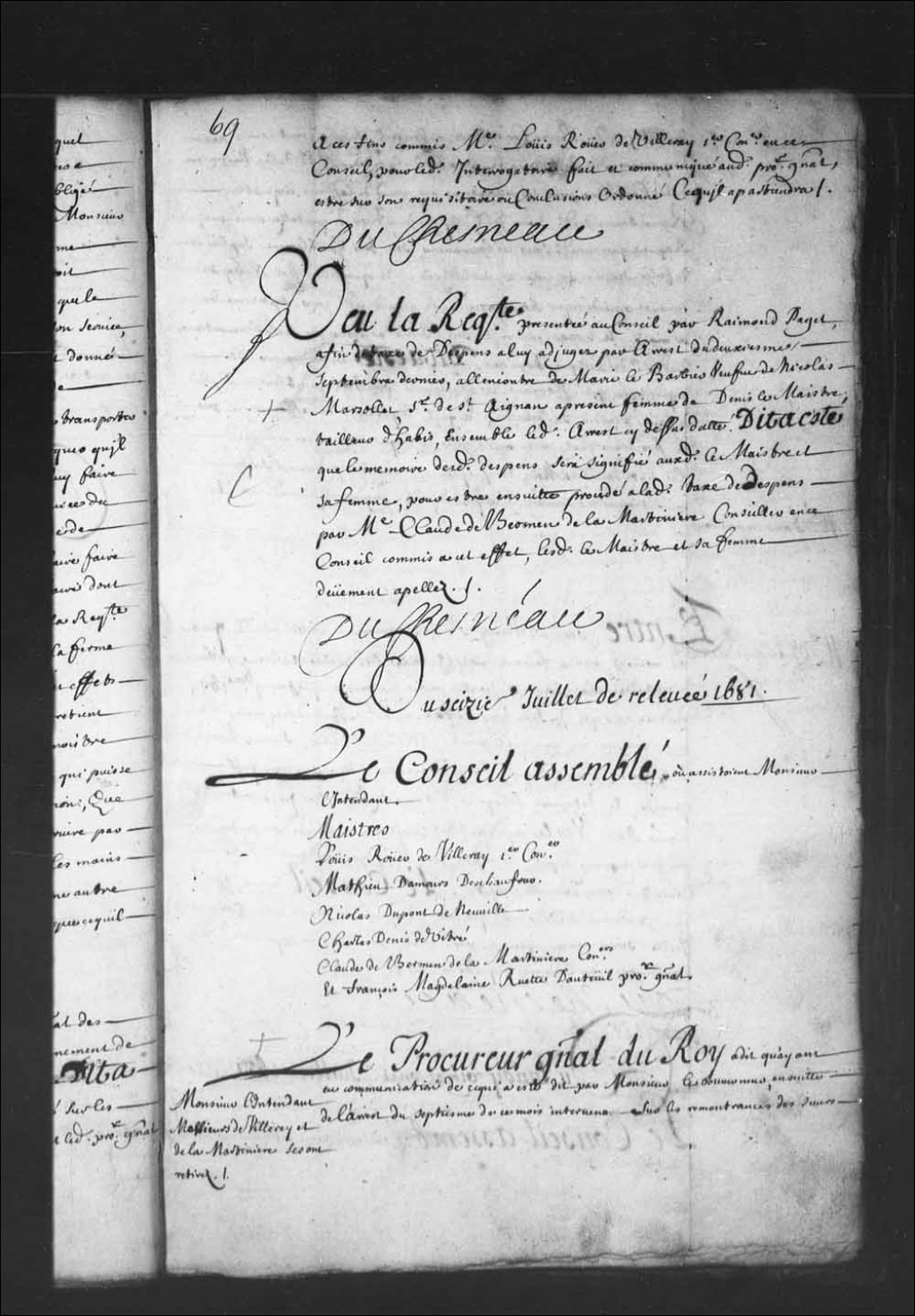 Transcription du texte avec orthographe modernisée : «Vu la requête présentée au Conseil par Raymond Paget afin de taxe de dépens à lui adjugés par arrêt du deuxième septembre dernier à l'encontre de Marie LeBarbier veuve de Nicolas Marsollet sieur de Saint-Aignan, à présent femme de Gabriel Lemaistre tailleur d'habits. Ensemble ledit arrêt ci-dessus daté. Dit a été que le mémoire desdits dépens sera signifié auxdits Lemaistre et sa femme, pour être ensuite procédé à ladite taxe de dépens par maître Claude de Bermen de la Martinière conseiller en ce Conseil commis à cet effet, lesdits Lemaistre et sa femme dûment appelés. DUCHESNEAU.»