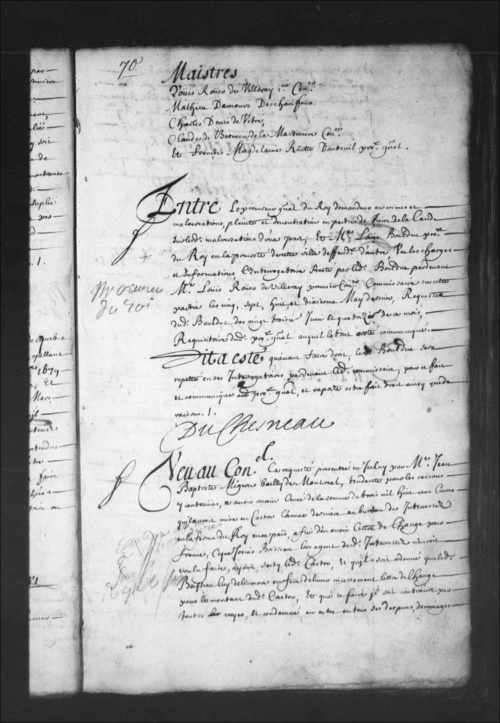 Transcription du texte avec orthographe modernisée : «Vu au Conseil la requête présentée en icelui par maître Jean-Baptiste Migeon bailli de Montréal; tendante pour les raisons y contenues à avoir mainlevée de la somme de trois mille huit cents livres qu'il aurait mises en castor l'année dernière au bureau des intéressés en la ferme du Roi en ce pays, afin d'en avoir lettre de change pour France, ce que Josias Boisseau lors agent desdits intéressés n'aurait voulu faire, ayant saisi ledit castor, et qu'il soit ordonné que ledit Boisseau lui délivrera ou fera délivrer incessamment lettre de change pour le montant dudit castor, et qu'à ce faire il soit contraint par toutes voies, et condamné en outre en tous ses dépens dommages et intérêts, sur laquelle requête aurait été ordonné communication au procureur général ensemble des informations encommencées par maître Mathieu Damours à la requête dudit Boisseau contre ledit Migeon. Vu aussi [...]