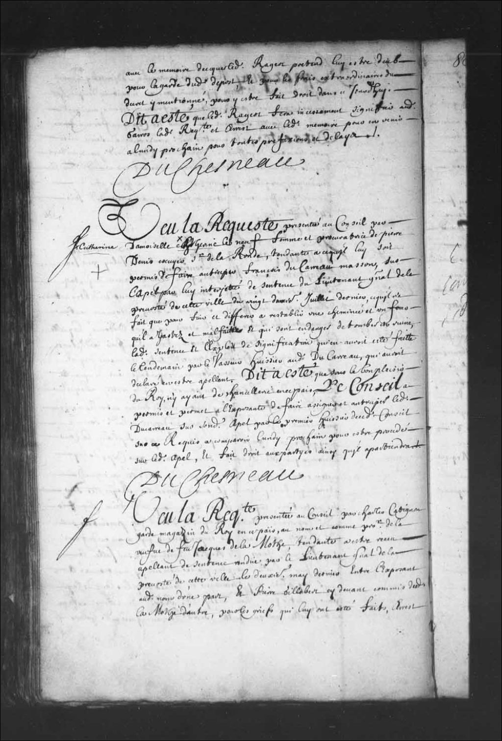 Transcription du texte avec orthographe modernisée : «Vu la requête présentée au Conseil par demoiselle Catherine Leneuf femme et procuratrice de Pierre Denis écuyer sieur de Laronde tendante à ce qu'il lui soit permis de faire anticiper François du Carreau maçon, sur l'appel par lui interjeté de sentence du lieutenant général de la prévôté de cette ville du vingt-deuxième juillet dernier, ce qu'il n'a fait que pour fuir et différer à rétablir une cheminée et un four qu'il a gâtés et mal faits et qui sont en danger de tomber en ruine, ladite sentence et l'exploit de signification qui en aurait été fait le lendemain par Levasseur huissier audit du carreau qui aurait déclaré en être appelant, dit a été que sous le bon plaisir du Roi n'y ayant de chancellerie en ce pays, le Conseil a permis et permet à l'exposante de faire assigner et anticiper ledit Ducarreau sur sondit appel, par le premier huissier de ce dit Conseil sur ce requis à comparaître lundi prochain, pour être procédé sur ledit appel et fait droit aux parties ainsi qu'il appartiendra. DUCHESNEAU.»