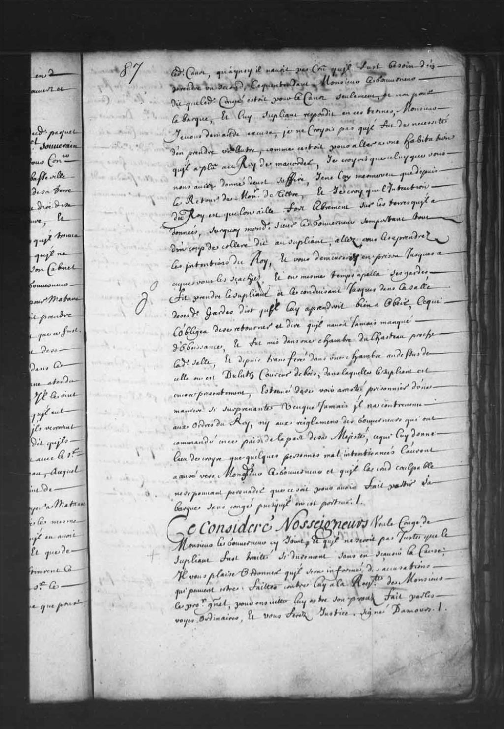 Transcription du texte avec orthographe modernisée : «Plus a aussi été fait lecture d'un congé dont le terme en suit, le comte de Frontenac conseiller du Roi en ses Conseils gouverneur et lieutenant général pour sa Majesté en Canada et pays de la Nouvelle-France. Nous permettons au sieur Damours de Clignancourt et à Delestre dit Le Valon d'aller dans un canot à la Rivière Matane appartenante au sieur Damours père dudit sieur de Clignancourt et où il a une habitation, afin d'y disposer les choses pour la pêche, et en attendant que leur barque puisse les aller joindre audit lieu à la fonte des glaces, à condition cependant de ne porter aucunes marchandises ni boissons pour la traite avec les Sauvages, ni de commercer avec eux, sous quelque prétexte que ce puisse être, à moins que ce ne soit par accommodement avec le sieur Boisseau directeur général de la ferme et droits du Roi en ce pays, à peine d'en répondre en leur nom. leur enjoignant [...]