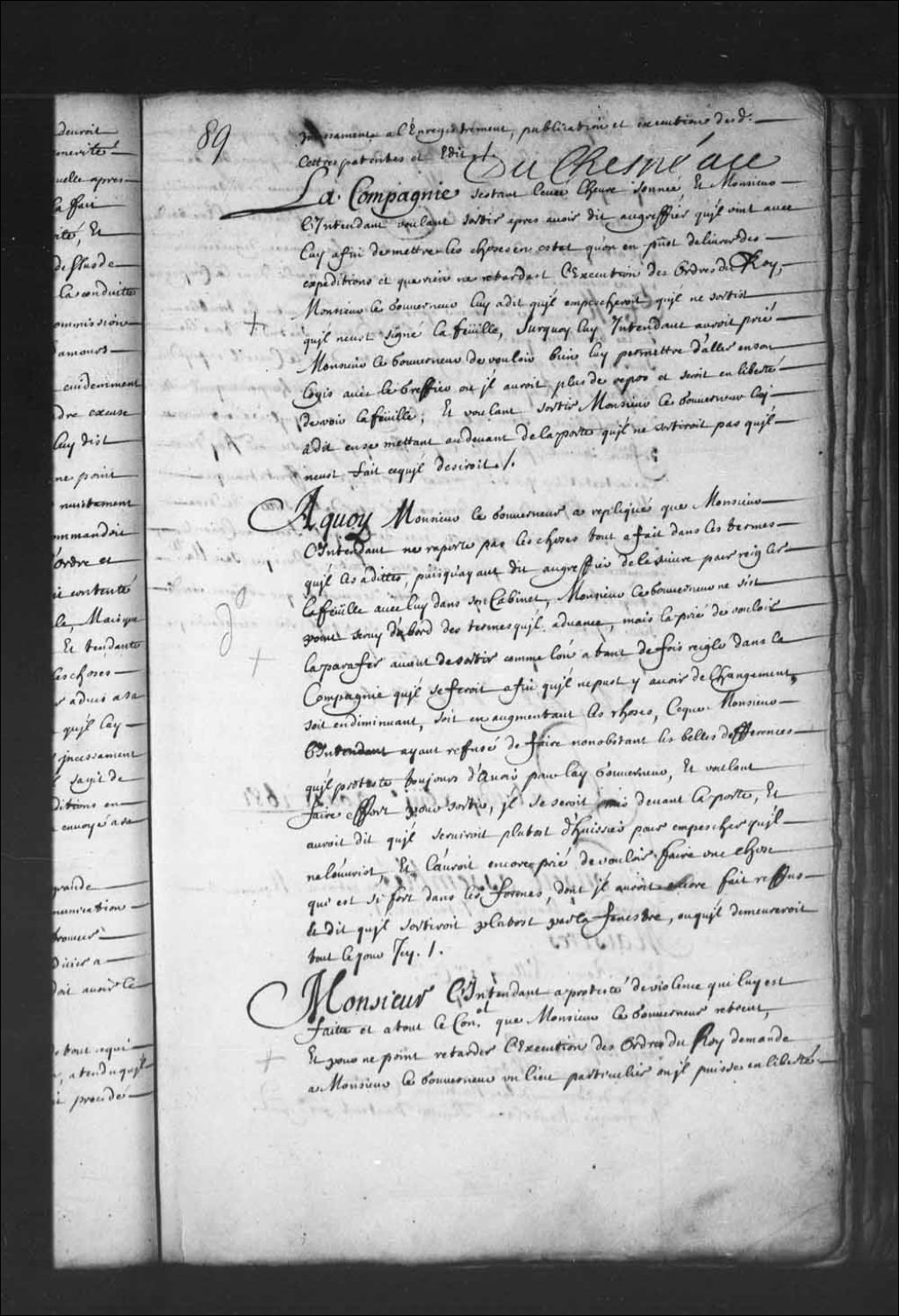 - Transcription du texte avec orthographe modernisée : «La compagnie s'étant levée l'heure sonnée, et Monsieur l'intendant voulant sortir après avoir dit au greffier qu'il vint avec lui afin de mettre les choses en état qu'on en pût délivrer des expéditions et que rien ne retardât l'exécution des ordres du Roi, Monsieur le gouverneur lui a dit qu'il empêcherait qu'il ne sortît qu'il n'eût signé la feuille; sur quoi lui intendant aurait prié Monsieur le gouverneur de vouloir bien lui permettre d'aller en son logis avec le greffier où il aurait plus de repos et serait en liberté de voir la feuille, et voulant sortir Monsieur le gouverneur lui a dit en se mettant au-devant de la porte qu'il ne sortirait pas qu'il n'eût fait ce qu'il désirait. À quoi Monsieur le gouverneur a répliqué que Monsieur l'intendant ne rapporte pas les choses tout à fait dans les termes qu'il les a dites, puis qu'ayant dit au greffier de le suivre pour régler la [...]