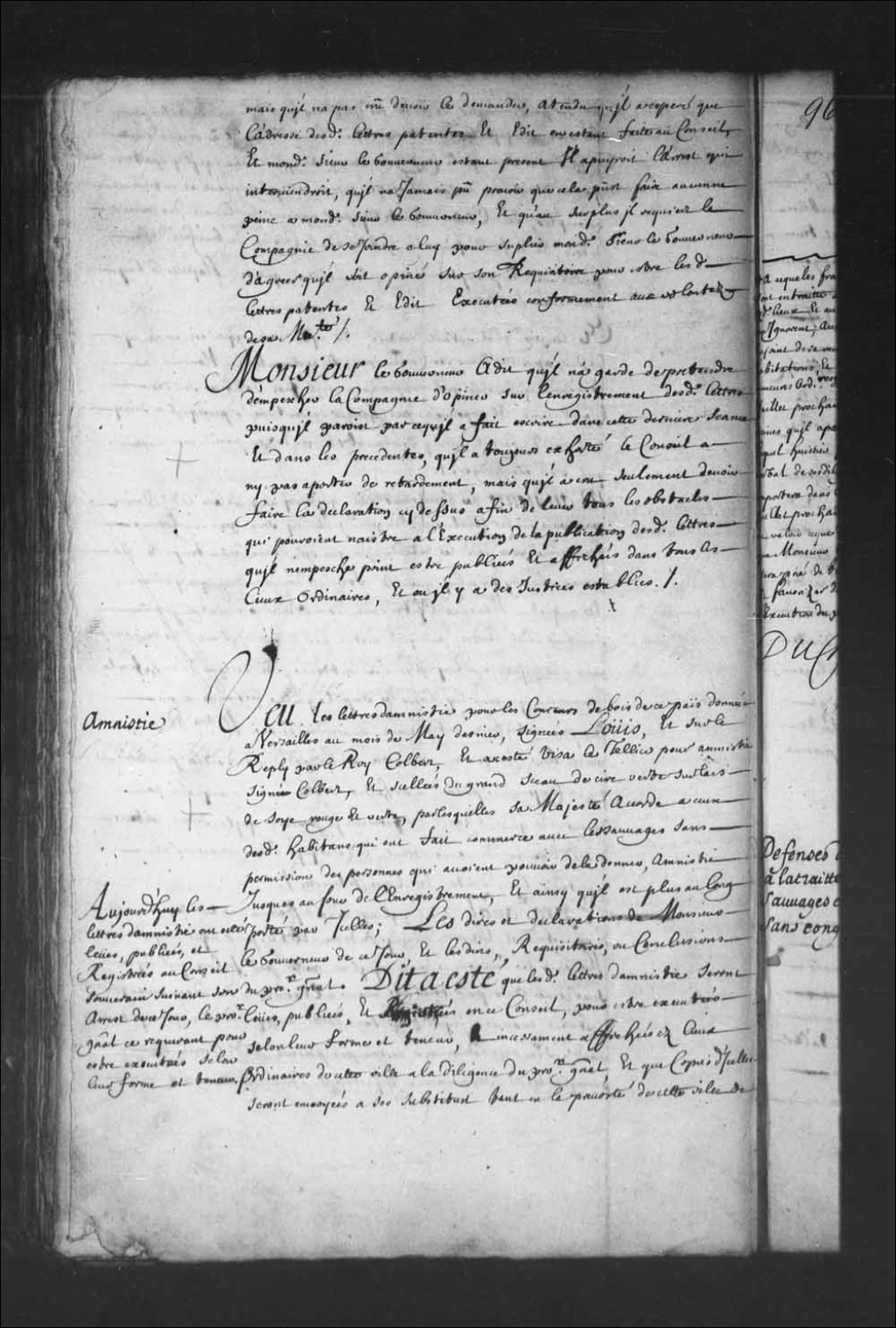 - Transcription du texte avec orthographe modernisée : «Dit a été que lesdites lettres d'amnistie seront lues, publiées, et registrées en ce Conseil, pour être exécutées selon leur forme et teneur, et incessamment affichées aux lieux ordinaires de cette ville, à la diligence dudit procureur général, et que copies d'icelles seront envoyées à son substitut tant en la prévôté de cette ville de Québec, que des juridictions des Trois-Rivières et Montréal, pour être pareillement lues publiées et registrées lesdites juridictions et affichées aux lieux accoutumés à la diligence desdits substituts qui en certifieront le Conseil dans deux mois et afin que ceux desdits François qui sont allés traiter dans la profondeur des bois avec les nations sauvages éloignées n'en puissent ignorer, ordonne ledit Conseil qu'à la diligence de l'agent des intéressés en la ferme des droits de sa Majesté en ce pays, copies desdites lettres d'amnistie seront portées [...]