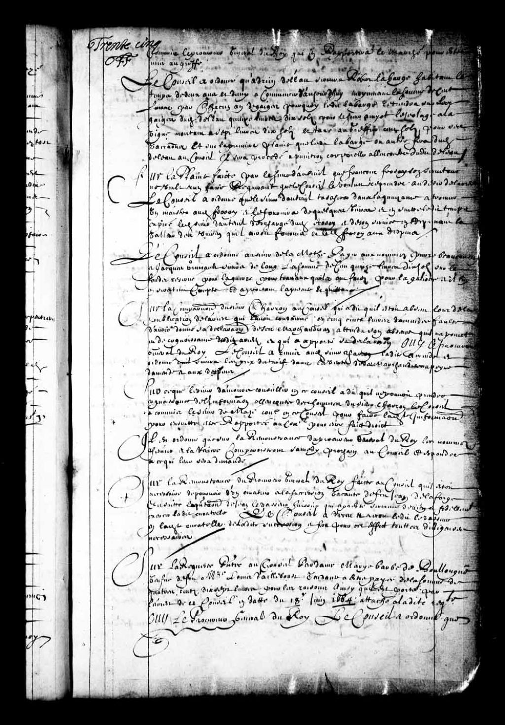 - Transcription du texte avec orthographe modernisée : «Sur la requête présentée au Conseil par dame Marie Barbe de Boullongne veuve de feu messire Louis Dailleboust tendante à être payée de la somme de quatre cents dix-sept livres pour les raisons ainsi qu'il est porté par l'arrêt de ce Conseil en date du 18e juin 1664 attaché à ladite requête ouï le procureur général du Roi. Le Conseil a ordonné que ledit arrêt sera exécuté ce faisant que ladite dame sera payée de ladite somme de quatre cents dix-sept livres sur le premier fonds destiné pour l'acquit des dettes du pays et par préférence à tous autres.»