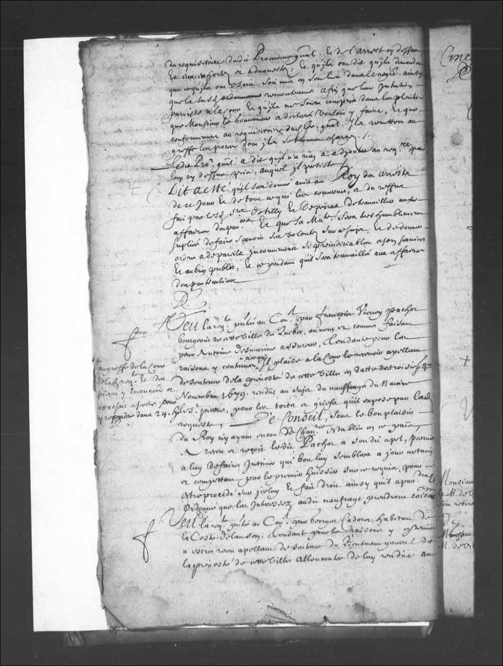 Transcription du texte avec orthographe modernisée : «Vu la requête présentée au Conseil par François Vienney Pachot bourgeois de cette ville de Québec, au nom et comme faisant pour Antoine desmarin assureur, tendante pour les raisons y contenues à ce qu'il plaise à la Cour le recevoir appelant de sentence de la prévôté de cette ville en date du troisième et quatrième novembre 1679 rendue au sujet du naufrage du navire le Saint-Pierre pour les torts et griefs qu'il expose par ladite requête, le Conseil sous le bon plaisir du Roi n'y ayant encore de chancellerie établie en ce pays, a reçu et reçoit ledit Pachot à sondit appel permis à lui de faire intimer qui bon lui semblera à jour certain et compétent par le premier huissier sur ce requis, pour être procédé sur icelui et fait droit ainsi qu'il appartiendra et ordonne que les intéressés audit naufrage prendront communication au greffe de la Cour de ladite requête et des pièces y