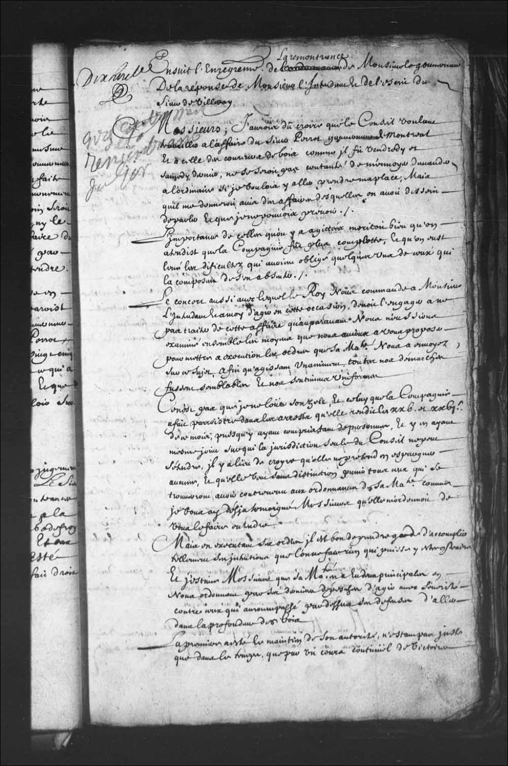 - Transcription du texte avec orthographe modernisée : «Ensuit l'enregistrement de la remontrance de Monsieur le gouverneur de la réponse de Monsieur l'intendant et de l'écrit du sieur de Villeray. Messieurs; J'aurais dû croire que le Conseil voulant travailler à l'affaire du sieur Perrot gouverneur de Montréal et à celle des coureurs de bois comme il fit vendredi et samedi dernier, ne se serait pas contenté m'envoyer demander à l'ordinaire si je voulais y aller prendre ma place, mais qu'il me donnerait avis des affaires desquelles on aurait dessein de parler et que je ne pouvais prévoir. L'importance de celles qu'on y a agitées méritait bien qu'on attendit que la compagnie fut plus complète, et qu'on eût levé les difficultés qui avaient obligé quelques-uns de ceux qui la composent de s'en absenter. Le concert aussi avec lequel le Roi nous commande à Monsieur l'intendant et à moi d'agir en cette occasion, devait l'engager à ne pas traiter [...]