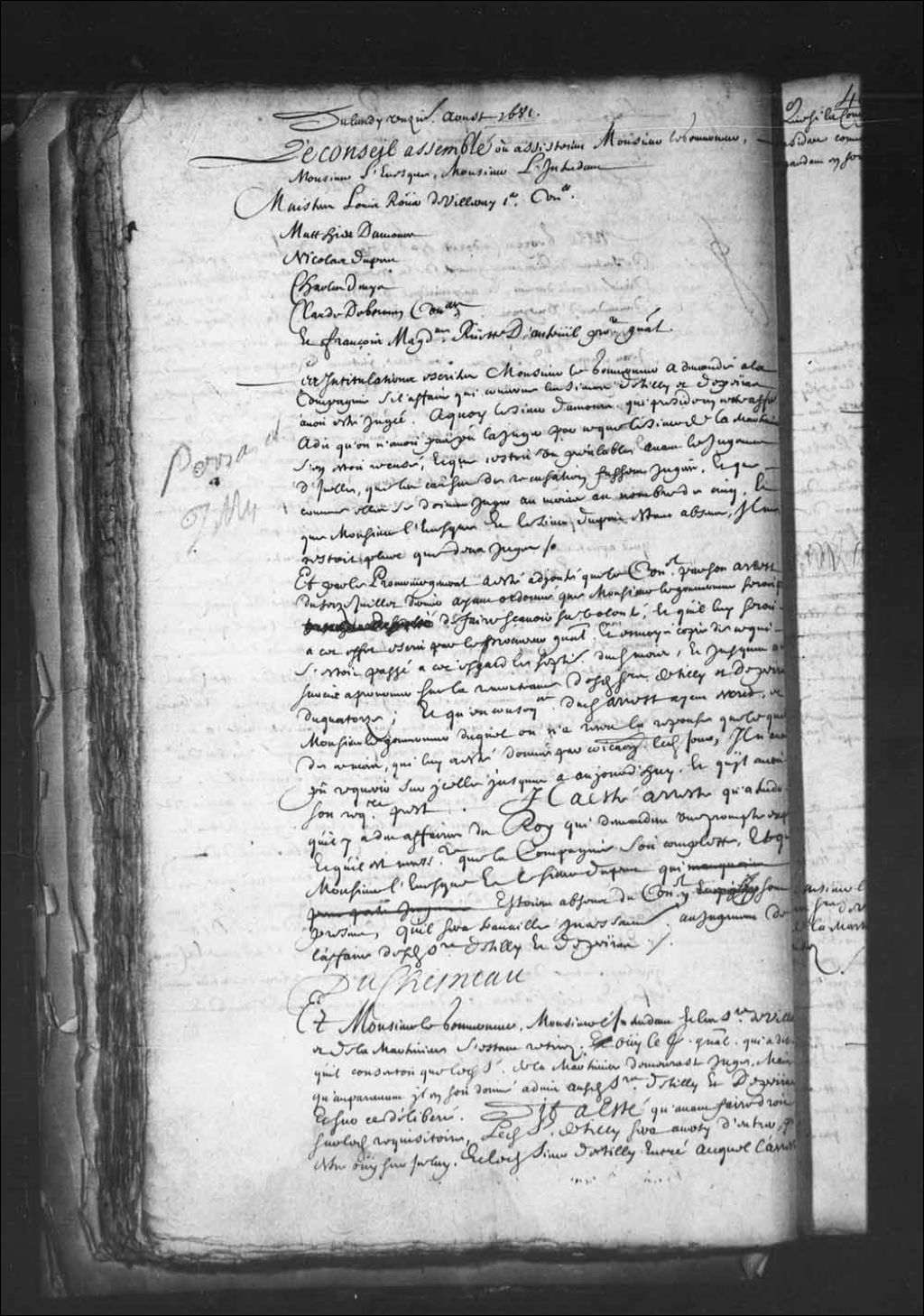 Arrêt ordonnant d'envoyer au Roi les remontrances des sieurs de Tilly et de Peiras et les autres pièces s'y rattachant, suivant l'arrêt du 23 avril 1681, afin qu'il lui plaise de faire connaître quelle sera sa volonté; et que les dits sieurs de Tilly et de Peiras viendront aux assemblées de la Compagnie pour travailler, tant aux affaires générales que particulières, 11 août 1681, Archives nationales à Québec, Fonds Conseil souverain, (03Q,TP1,S28,P2980).
