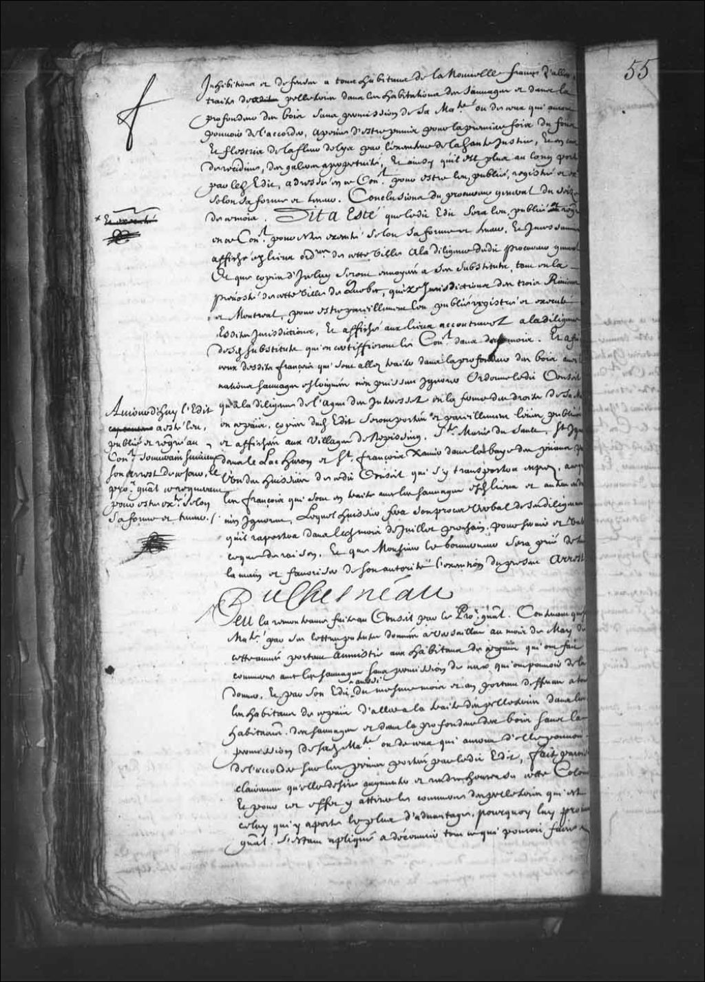 - Transcription du texte avec orthographe modernisée : «Vu la remontrance faite au Conseil par le procureur général contenant que sa Majesté par ses lettres patentes données à Versailles au mois de mai de cette année portant amnistie aux habitants de ce pays qui ont fait commerce avec les Sauvages sans permission de ceux qui ont pouvoir de la donner, et par son édit aussi du même mois et en portant défenses à tous les habitants de ce pays d'aller à la traite des pelleteries dans les habitations des Sauvages et dans la profondeur des bois sans la permission de sa dite Majesté ou de ceux qui auront d'elle pouvoir de l'accorder sur les peines portées par ledit édit, fait paraître clairement qu'elle désire augmenter et rendre heureuse cette colonie et pour cet effet y attirer le commerce des pelleteries qui est celui qui y apporte le plus d'avantage, pourquoi lui procureur général s'étant appliqué à découvrir tout ce qui pourrait faire [...]