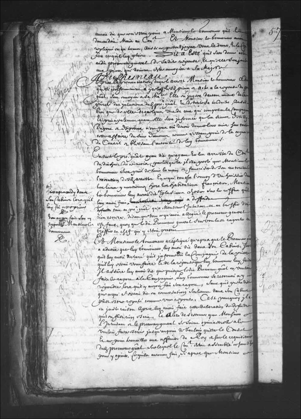 - Transcription du texte avec orthographe modernisée : «Après la prononciation duquel arrêt Monsieur le gouverneur a dit que si conformément à icelui, lesdites pièces et acte à la réponse du procureur général, sont envoyées à sa Majesté, elle en jugera d'autant mieux de la pureté des intentions dudit procureur général et de toute sa conduite, aussi bien que de celle de quelques-uns de ceux qui composent la compagnie, et principalement quant elle sera informée que les sieurs de Tilly Dupont et Depeiras n'ont pas cru devoir donner leur avis sur toute cette affaire du sieur Damours comme n'étant point de la connaissance du Conseil et blessant l'autorité de lui gouverneur. Ensuite le procureur général ayant dit qu'ayant eu les arrêts du Conseil du dix-huit de ce mois par lesquels il est porté que Monsieur le gouverneur sera prié de tenir la main et favoriser de son autorité l'exécution desdits arrêts en ce qui touche l'envoi d'un huissier [...]