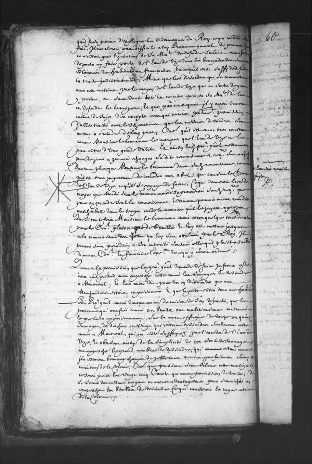 - Transcription du texte avec orthographe modernisée : «Et ensuite Monsieur le gouverneur a dit qu'il s'était informé de plusieurs personnes qui avaient connaissance des lieux où les Français sont en traite parmi les nations éloignées de la manière dont on pourrait les faire avertir des lettres d'amnistie que le Roi leur aurait accordées, et du temps qui leur serait à peu près nécessaire pour pouvoir se rendre dans lesdites habitations, et que sur le rapport uniforme que ceux à qui il en avait parlé lui en avaient fait il en avait fait dresser un mémoire dont il priait la compagnie de vouloir entendre la lecture afin que si elle le jugeait à propos on étendît le terme qui était porté par l'arrêt du dix-huit de ce mois et qu'on n'obligeât pas les Français qui se trouveraient les plus éloignés a des choses impossibles. Lecture faite dudit mémoire conçu en ces termes. Il faut si on souhaite que les Français qui sont en traite chez les [...]