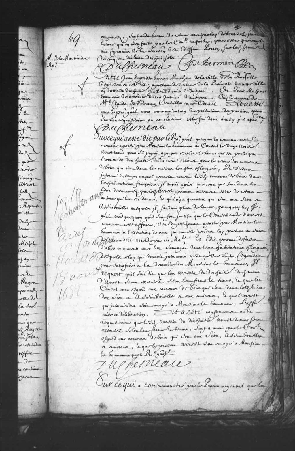 Transcription du texte avec orthographe modernisée : «Sur ce qui a été remontré par le procureur général que la récolte étant ouverte en divers lieux, il est de l'intérêt du public que les habitants ne soient divertis de s'y appliquer entièrement sans qu'ils en puissent être détournés par des procès, pourquoi il requiert qu'il y soit pourvu ainsi que la compagnie fait chaque année. Le Conseil a donné vacances jusqu'au vingtième octobre prochain que la compagnie rentrera, sauf à s'assembler sur le procès extraordinairement poursuivi par le procureur général contre maître Louis Boulduc (Bolduc) procureur du Roi en la prévôté de cette ville, et seulement sur les autres procès criminels et affaires qui requerront célérité. DUCHESNEAU.»