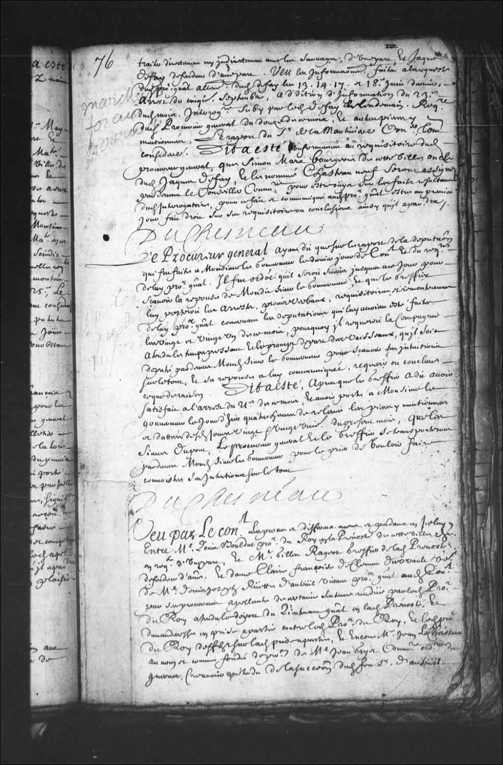Transcription du texte avec orthographe modernisée : «Le procureur général ayant dit que sur le rapport de la députation qui fut faite à Monsieur le gouverneur le dernier jour du Conseil et du registre de lui procureur général, il fut ordonné qu'il serait sursis jusqu'à ce jour pour savoir la réponse de mondit sieur le gouverneur, et que le greffier lui porterait les arrêts, procès-verbaux, réquisitoires et remontrances de lui procureur général concernant les députations qui lui avaient été faites les vingt et vingt et un de ce mois, pourquoi il requérait la compagnie attendu le temps pressant et le prompt départ des vaisseaux, qu'il soit député par devers mondit sieur le gouverneur pour savoir ses intentions sur le tout, et sa réponse à lui communiquée, requérir ou conclure ce que de raison. Dit a été, après que le greffier a dit avoir satisfait à l'arrêt du 21e de ce mois, et avoir porté à Monsieur le gouverneur le jourd'hier quatre