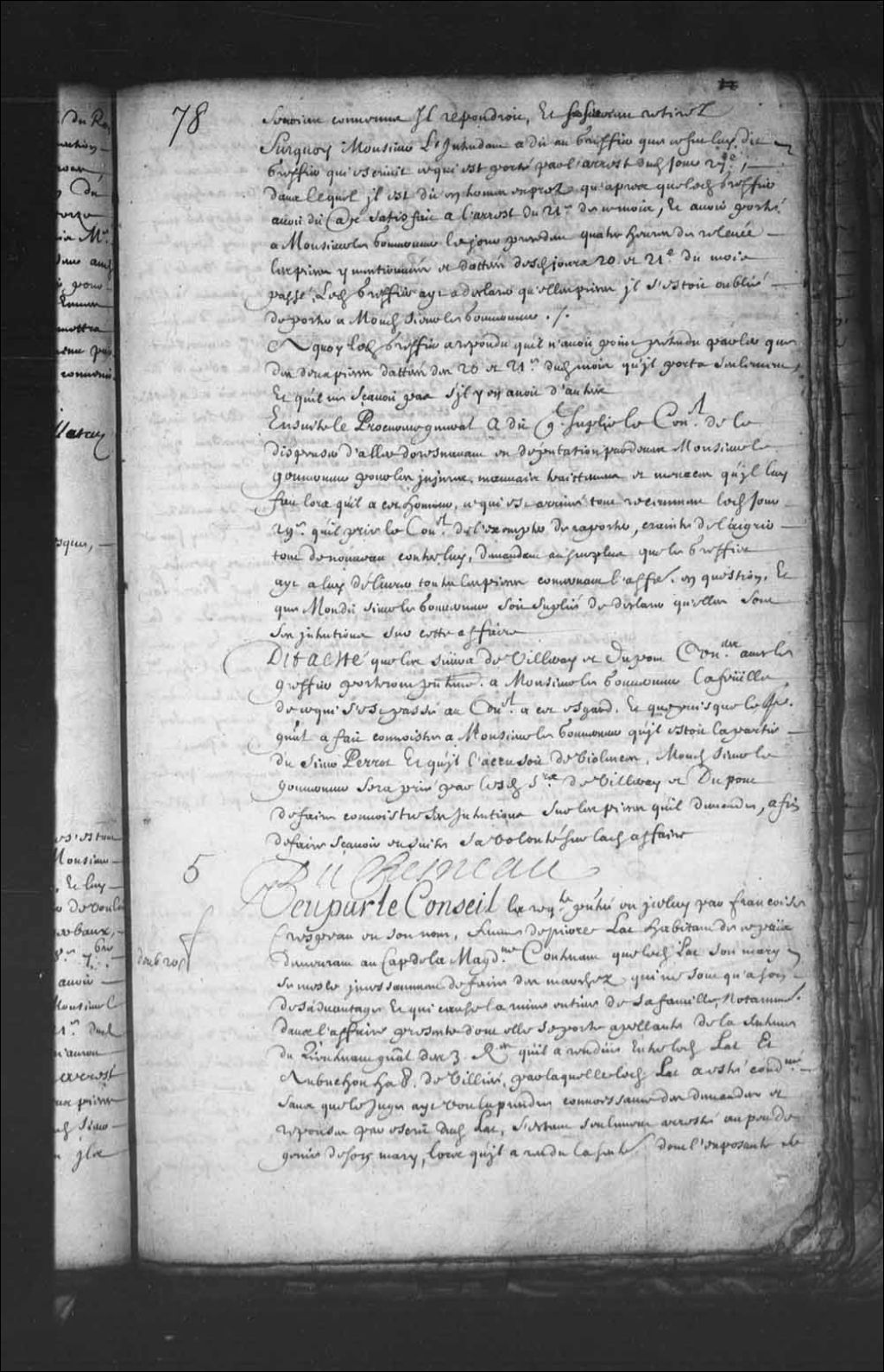 - Transcription du texte avec orthographe modernisée : «Vu par le Conseil la requête présentée en icelui par Françoise Crespeau en son nom, femme de Pierre Lat habitant de ce pays demeurant au Cap de la Madeleine contenant que ledit Lat son mari, se mêle incessamment de faire des marchés qui ne sont qu'à son désavantage et qui cause la ruine entière de sa famille, notamment dans l'affaire présente dont elle se porte appelante de la sentence du lieutenant général des Trois-Rivières qu'il a rendue entre ledit Lat et Aubuchon habitant de Villiée, par laquelle ledit Lat a été condamné sans que le juge ait voulu prendre connaissance des demandes et réponses par écrit dudit Lat, s'étant seulement arrêté au peu de génie de son mari, lors qu'il a rendu la sentence dont l'exposante se porte pour appelante en son nom en cette Cour, ne le faisant que pour éviter sa ruine totale et pour empêcher sondit mari de faire aucuns marchés ni actes de justice [...]