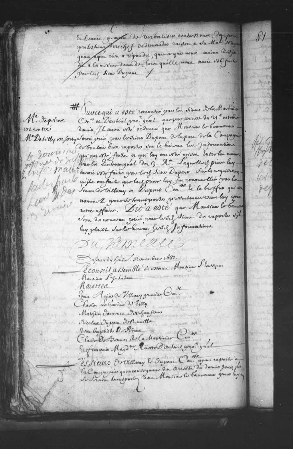 - Transcription du texte avec orthographe modernisée : «Du samedi huitième novembre 1681. Le Conseil assemblé où étaient Monsieur l'évêque Monsieur l'intendant. Maîtres. Louis Rouer de Villeray premier conseiller. Charles Legardeur de Tilly. Mathieu Damours Deschaufour. Nicolas Dupont de Neuville. Jean-Baptiste DePeiras. Claude de Bermen de la Martinière conseillers. Et François Madeleine Ruette d'Auteuil procureur général. Les sieurs de Villeray et Dupont conseillers ayant rapporté à la compagnie qu'en conséquence des arrêts du dernier jour ils se seraient transportés vers Monsieur le gouverneur pour lui faire les prières portées par lesdits arrêts, lesquelles ayant faites Monsieur le gouverneur leur aurait fait réponse, et l'aurait à l'instant même fait rédiger par écrit par le greffier, desquelles réponses la teneur ensuit. Ce jourd'hui quatrième novembre 1681 de relevée, sur ce que les sieurs de Villeray et Dupont conseillers au [...]
