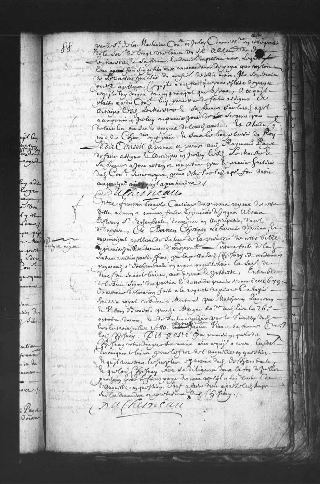 - Transcription du texte avec orthographe modernisée : «Entre François GENAPLE concierge des prisons royaux de cette ville, au nom et comme fondé de pouvoir de Jacques Alexis de Fleury sieur Dechambault, demandeur en anticipation d'appel d'une part, et Bertrand CHESNAY la GARENNE défendeur et au principal appelant de sentence de la prévôté de cette ville du premier juillet dernier d'autre part. Parties ouïes, lecture faite de ladite sentence rendue par défaut, par laquelle ledit Chesnay est condamné payer audit sieur Dechambault en argent ou pelleteries la somme de deux cent soixante livres avec dépens et intérêts, ensemble de l'écrit signé des parties, et daté du premier novembre 1679, de certaine déclaration faite à la requête de Pierre Cabazié huissier royal résidant à Montréal par Mathurin Langevin et Urbain Brossard par-devant Maugues notaire audit lieu le 26e octobre dernier, et de sentence rendue par le bailli dudit lieu le 3e juillet 1680 au profit de Jacques Viau et sa femme contre ledit Chesnay dit a été par provision, que ledit Chesnay retiendra pas ses mains sur ce qu'il a reçu, la somme de 50 livres pour le fret de l'anguille en question et qu'il remettra le surplus en les mains dudit Dechambault; et que ledit Chesnay fera diligences dans la fin de juillet prochain pour se faire payer de ceux à qui il a fait vente de l'anguille en question, sauf à faire droit après ledit temps sur les demandes et prétentions dudit Chesnay. DUCHESNEAU.»