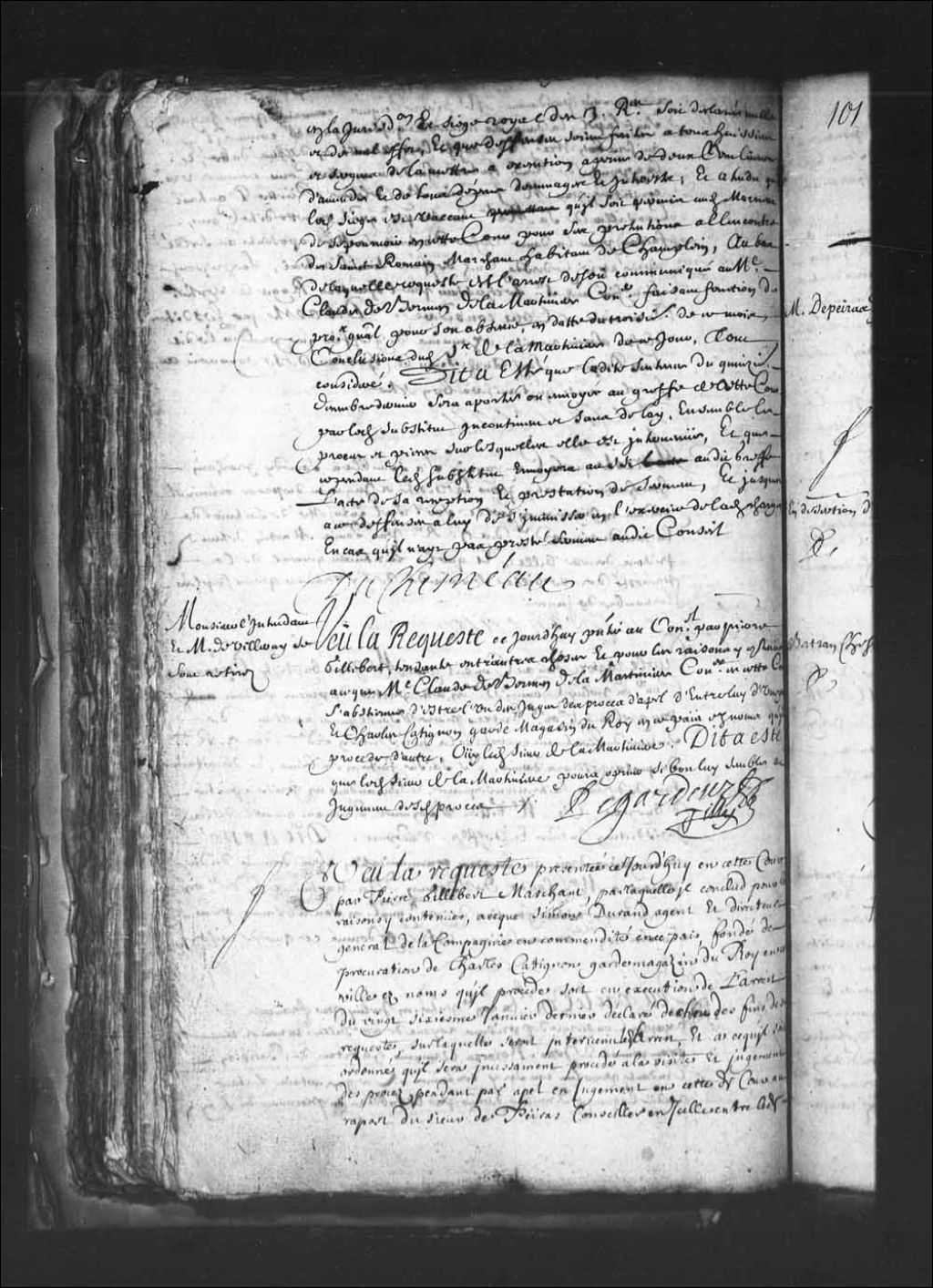 Transcription du texte avec orthographe modernisée : «Monsieur l'intendant et Monsieur de Villeray se sont retirés. Vu la requête ce jourd'hui présentée au Conseil par Pierre Gillebert, tendante entre autres choses et pour les raisons y contenues à ce que maître Claude de Bermen de la Martinière conseiller en cette Cour s'abstienne d'être l'un des juges des procès d'appel d'entre lui d'une part et Charles Catignon garde magasin du Roi en ce pays au nom qu'il procède d'autre, ouï ledit sieur de La Martinière. Dit a été que ledit sieur de La Martinière pourra opiner si bon lui semble au jugement desdits procès. LEGARDEUR DE TILLY.»