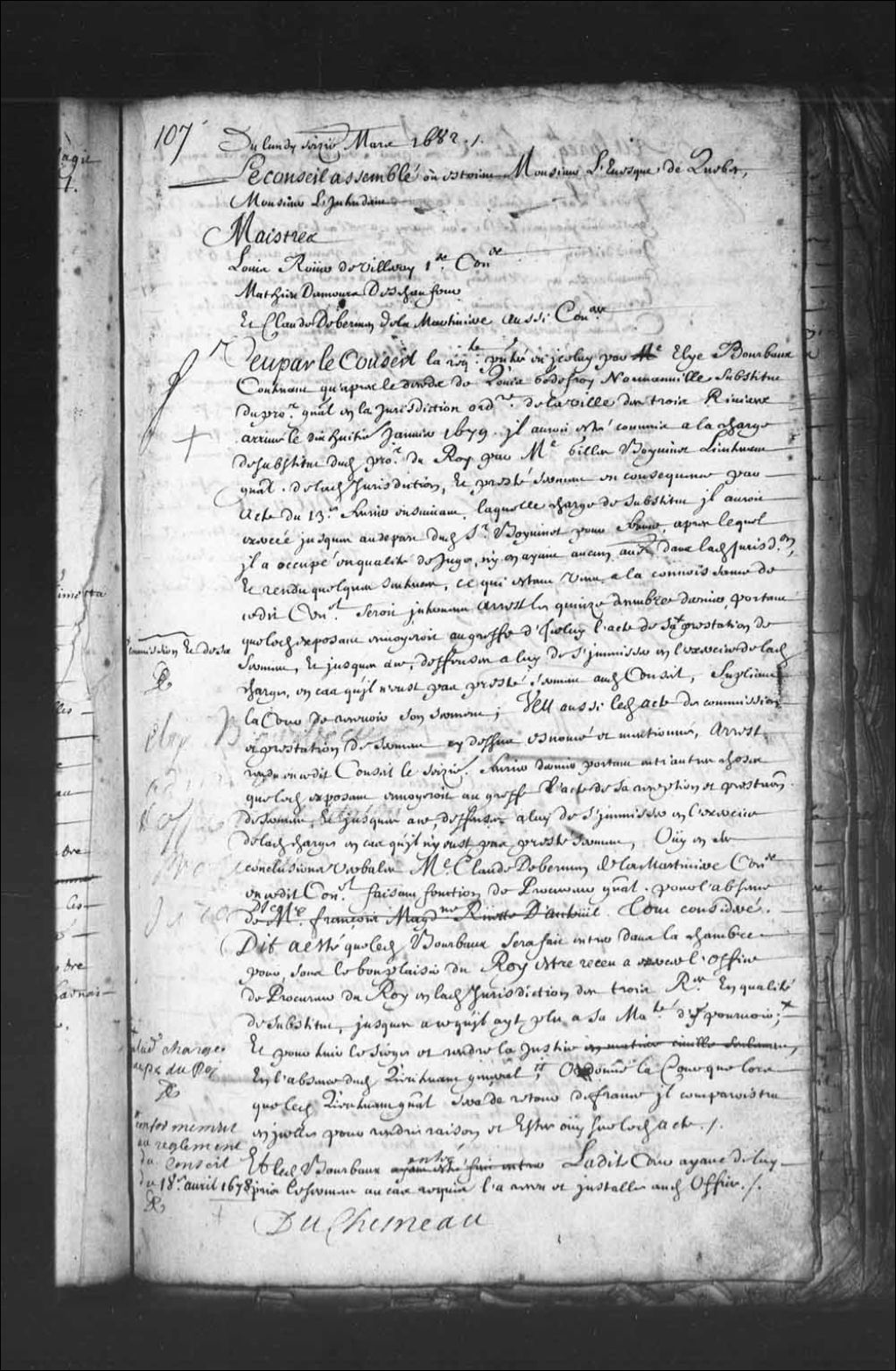 Transcription du texte avec orthographe modernisée : «Du lundi seizième mars 1682. Le Conseil assemblé où étaient Monsieur l'évêque de Québec, Monsieur l'intendant. Maîtres. Louis Rouer de Villeray premier conseiller. Mathieu Damours Deschaufour. Et Claude Debermen de la Martinière aussi conseillers. Vu par le Conseil la requête présentée en icelui par maître Elie Bourbaux contenant qu'après le décès de Louis Godefroy Normanville substitut du procureur général en la juridiction ordinaire de la ville des Trois-Rivières arrivé le dix-huitième janvier 1679 il aurait été commis à la charge de substitut dudit procureur du Roi par maître Gilles Boyvinet lieutenant général de ladite juridiction, et prêté serment en conséquence par acte du 13e février ensuivant, laquelle charge de substitut il aurait exercée jusqu'au départ dudit sieur Boyvinet pour France, après lequel il a occupé en qualité de juge, n'y en ayant aucun autre dans ladite juridiction, et rendu quelques sentences, ce qui étant venu à la connaissance de ce dit Conseil serait intervenu arrêt le quinze décembre dernier, portant que ledit exposant enverrait au greffe d'icelui l'acte de sa commission et de sa prestation de serment, et jusqu'à ce défenses à lui de s'immiscer en l'exercice de ladite charge, en cas qu'il n'eût pas prêté serment audit Conseil, suppliant la Cour de recevoir son serment; vu aussi ledit acte de commission et prestation de serment ci-dessus énoncé et mentionné, arrêt rendu en ce dit Conseil le seizième février dernier portant entre autres choses que ledit exposant enverrait au greffe l'acte de sa réception et prestation de serment, et jusqu'à ce, défenses à lui de s'immiscer en l'exercice de ladite charge en cas qu'il n'y eût pas prêté serment, ouï en ses conclusions verbales maître Claude de Bermen de la Martinière conseiller en ce dit Conseil faisant fonction de procureur général pour l'absence.»