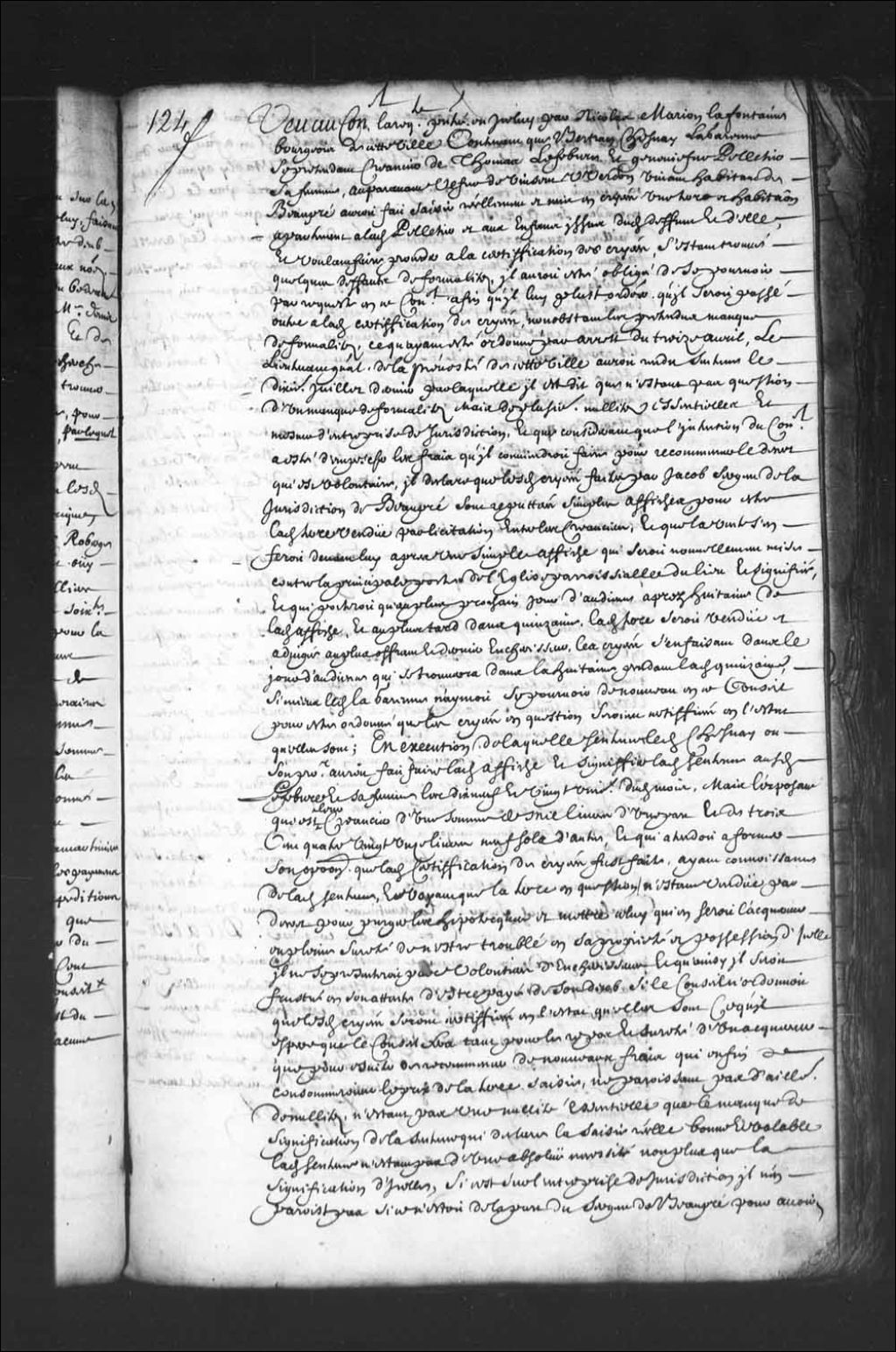 - Transcription du texte avec orthographe modernisée : «Vu au Conseil la requête présenté en icelui par Nicolas Marion Lafontaine bourgeois de cette ville contenant que Bertrand Chesnay la Garenne se prétendant créancier de Thomas Lefebvre et Geneviève Pelletier sa femme, auparavant veuve de Vincent Verdon vivant habitant de Beaupré aurait fait saisir réellement et mis en criée une terre et habitation appartenant à ladite Pelletier et aux enfants issus dudit défunt et d'elle, et voulant faire procéder à la certification des criées, s'étant trouvé quelques défauts de formalités, il aurait été obligé de se pourvoir par requête en ce Conseil afin qu'il lui plût ordonner qu'il serait passé outre à ladite certification des criées, nonobstant les prétendus manque de formalités, ce qu'ayant été ordonné par arrêt du treize avril, le lieutenant général de la prévôté de cette ville aurait rendu sentence le dixième juillet dernier par laquelle il [...]