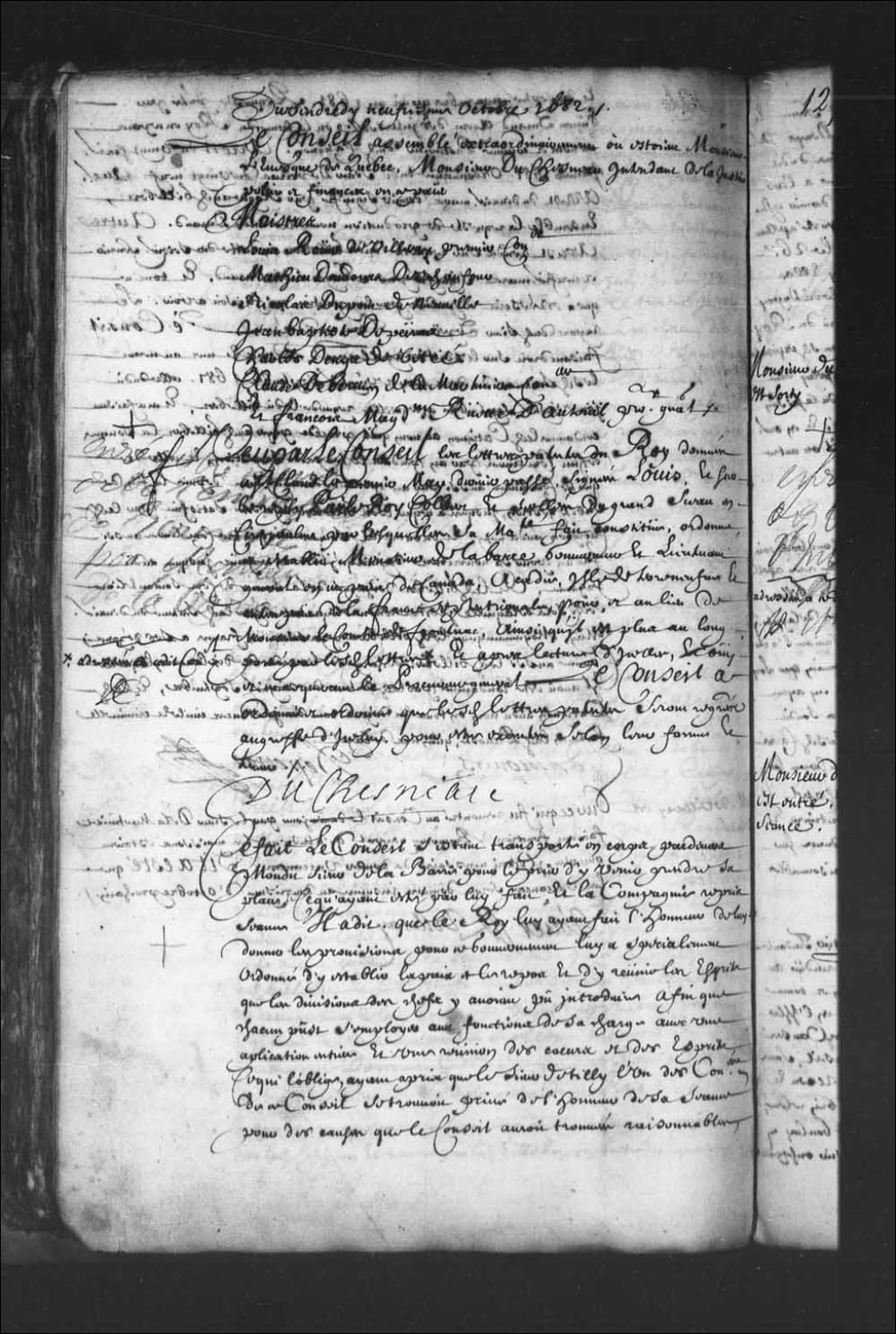 - Transcription du texte avec orthographe modernisée : «Ce fait, le Conseil s'étant transporté en corps par devers mondit sieur de Labarre pour le prier d'y venir prendre sa place, ce qu'ayant été par lui fait et la compagnie repris séance il a dit que le Roi lui ayant fait l'honneur de lui donner les provisions pour ce gouvernement lui a spécialement ordonné d'y établir la paix et le repos. Et d'y réunir les esprits que les divisions des chefs y avaient pu introduire afin que chacun pût s'employer aux fonctions de sa charge avec une application entière et une réunion des coeurs et des esprits, ce qui l'oblige, ayant appris que le sieur de Tilly l'un des conseillers de ce Conseil se trouvait privé de l'honneur de sa séance pour des causes que le Conseil aurait trouvées raisonnables, de prier la compagnie attendu que ce n'était point une affaire de crime qui fut imputé audit sieur de Tilly mais qui avait beaucoup de rapport aux différent passés entre Messieurs le gouverneur et l'intendant de faire inviter ledit sieur de Tilly de revenir prendre sa place sans que l'on examinât aucune chose de ce qui s'est passé, pour jouir des honneurs et profits de sa charge comme il aurait pu faire auparavant l'arrêté du Conseil, à quoi la compagnie ayant consenti avec joie, ledit sieur de Tilly étant rentré et ayant pris sa place ...»