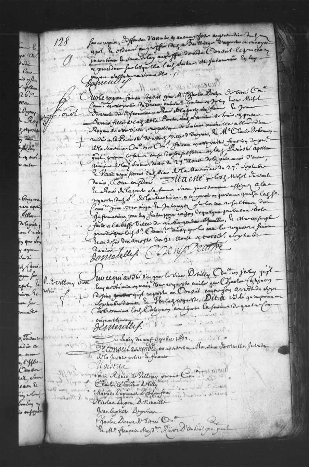 - Transcription du texte avec orthographe modernisée : «Sur le rapport fait au Conseil par maître Charles Deny de Vitré conseiller commissaire en cette partie du procès criminel pendant en icelui entre Michel Duvault dit descormiers, Renée de Laporte sa femme et Jeanne L'Arrivé fille de ladite de Laporte, ladite L'Arrivé détenue des prisons royaux de cette ville, appelant de sentence criminelle à l'encontre d'eux rendue en la prévôté de cette dite ville d'une part, et maître Claude de Bermen de la Martinière conseiller en ce Conseil faisant en cette partie fonction de procureur général prenant le fait et cause de son substitut en ladite prévôté appelant a minima de ladite sentence datée du 27e août de la présente année d'autre, et vu le réquisitoire dudit sieur de La Martinière du 27e septembre dernier, tout considéré. Dit a été que lesdits Michel Duvault et Renée de Laporte sa femme seront incessamment assignés à la requête dudit sieur de La Martinière à comparaître en personne par-devant ledit sieur commissaire pour être ouïs et interrogés sur les cas résultant des informations par lui faites pour raison de quelques prétendus vols faits à la basse-ville de Québec pendant l'incendie, et être au surplus procédé par ledit sieur commissaire ainsi que le cas le requerra suivant et au désir des arrêts du 31 août et troisième septembre derniers. DEMEULLES C. DENYS DE VITRÉ.»