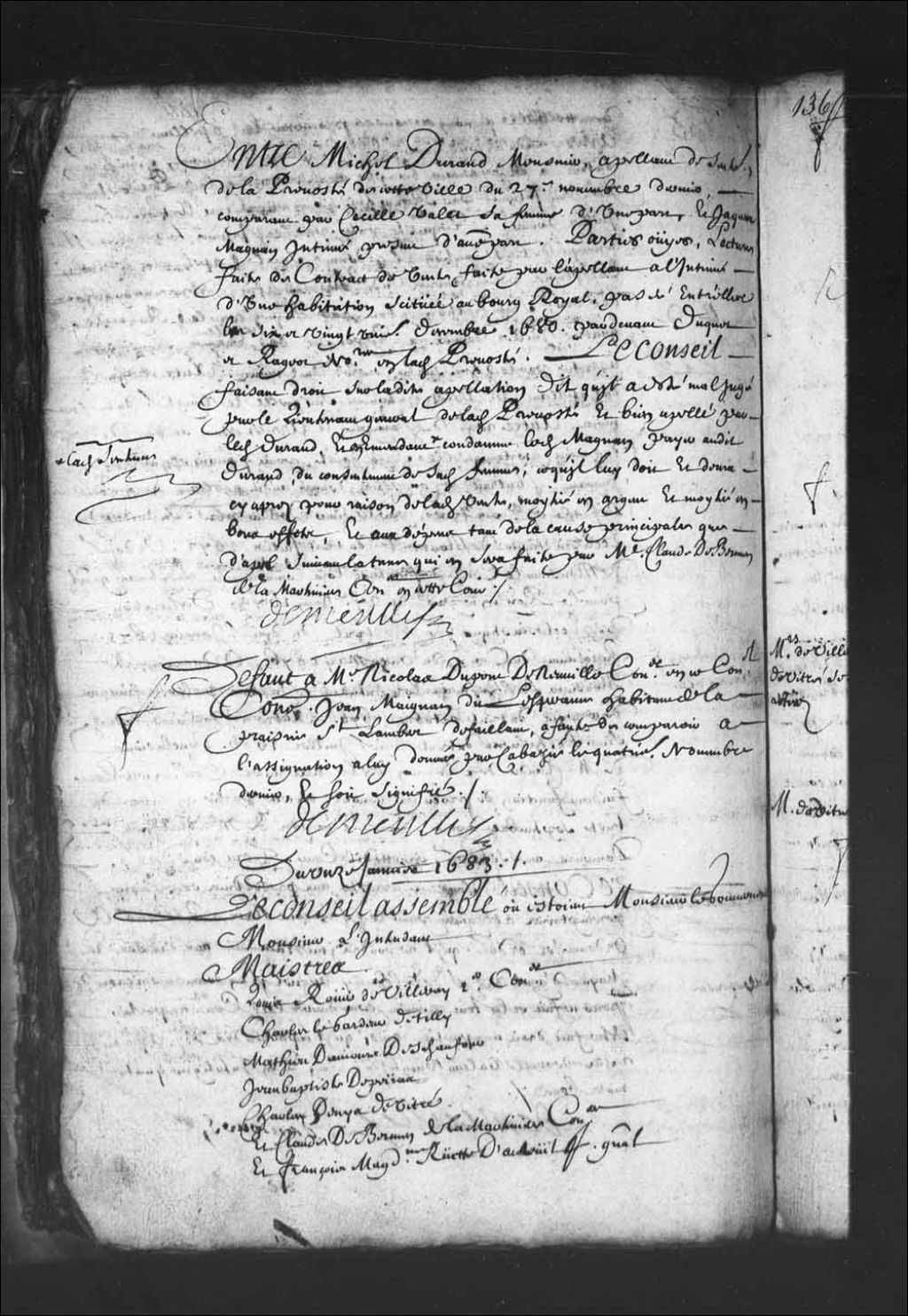 Transcription du texte avec orthographe modernisée : «Défaut à maître Nicolas Dupont de Neuville conseiller en ce Conseil contre Jean Maignan dit Lespérance habitant de La Prairie Saint-Lambert défaillant, à faute de comparaître à l'assignation à lui donnée par Cabazié le quatrième novembre dernier, et soit signifié. DEMEULLE.»