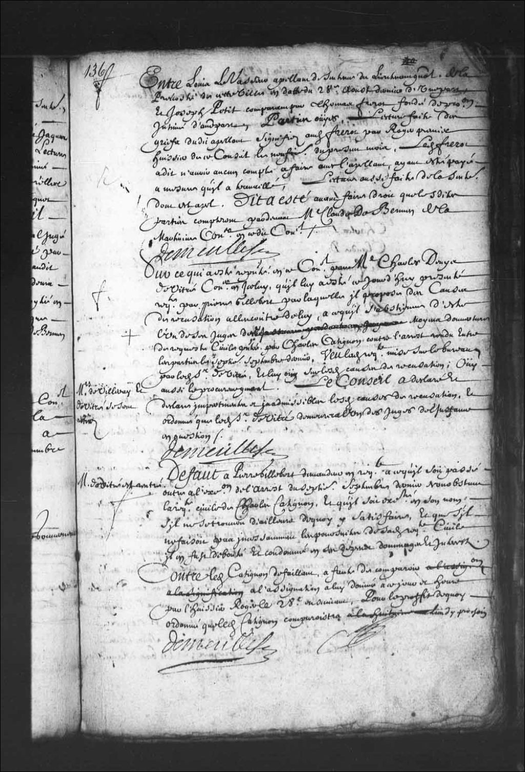 Défaut accordé à Pierre Gilbert, marchand contre Charles Catignon, garde magasin du roi, sur la requête civile de ce dernier, 11 janvier 1683, Archives nationales à Québec, Fonds Conseil souverain, (03Q,TP1,S28,P3207).