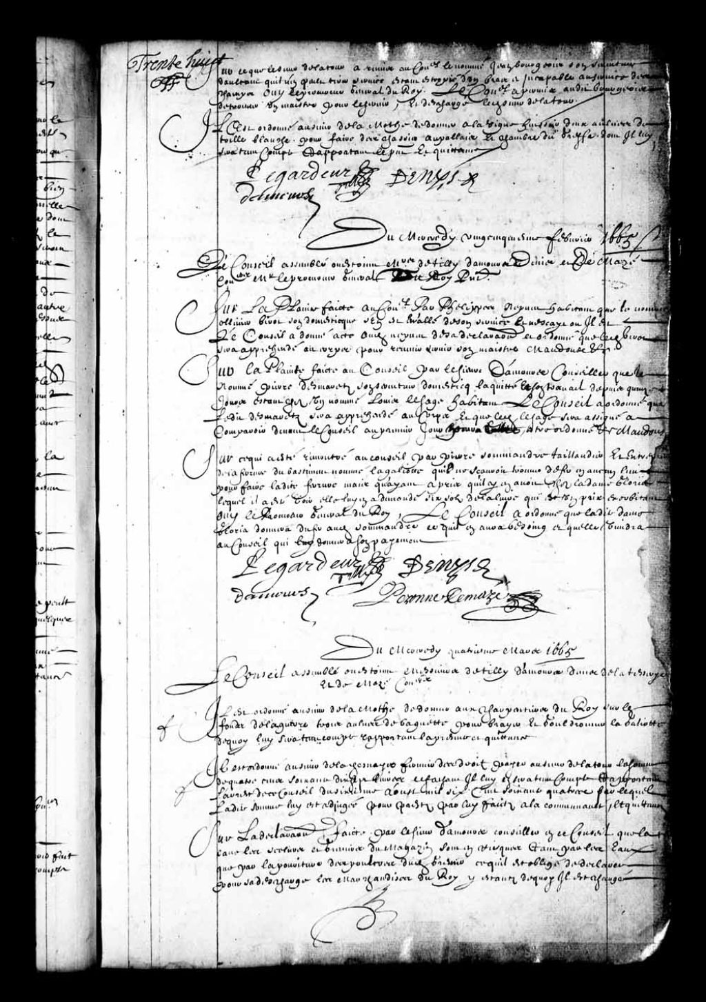 Transcription du texte avec orthographe modernisée : «Du mercredi quatrième mars 1665. Le Conseil assemblé où étaient Messieurs de Tilly D'Amours Denis de la Tesserye et de Mazé conseillers il est ordonné au sieur de LaMothe de donner aux charpentiers du Roi sur le fonds de la guerre trois aulnes de baguette pour brayer et goudronner la galiote de quoi lui sera tenu compte rapportant la présente et quittance.»