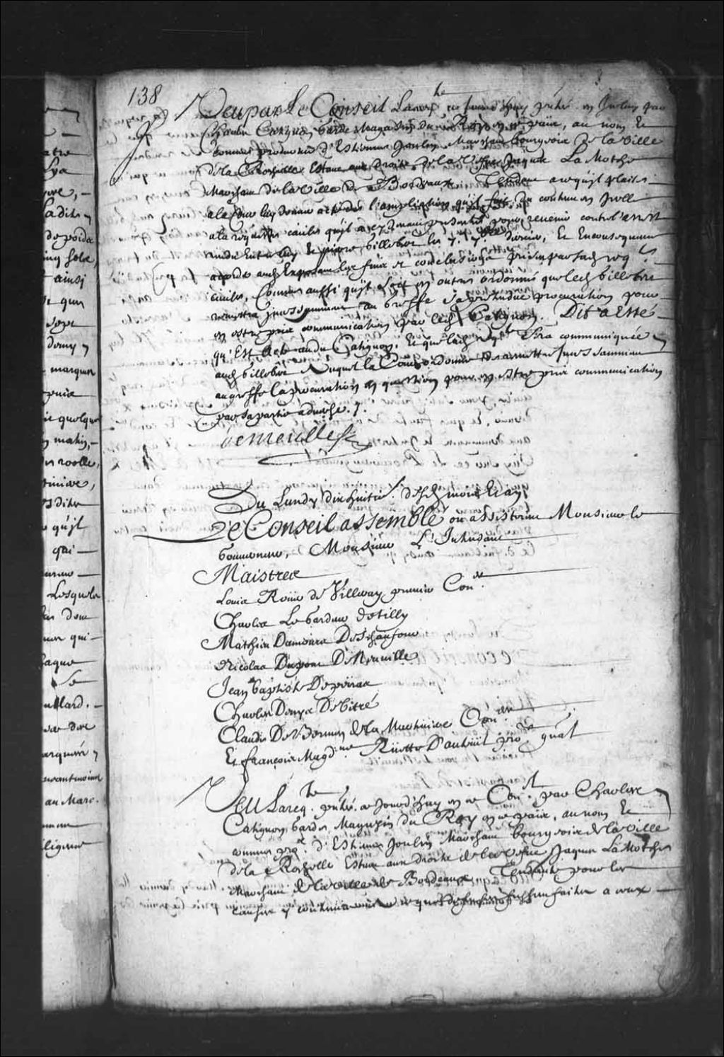 - Transcription du texte avec orthographe modernisée : «Du lundi dix-huitième desdits mois et an. Le Conseil assemblé où assistaient Monsieur le gouverneur, Monsieur l'intendant. Maîtres. Louis Rouer de Villeray premier conseiller. Charles Legardeur de Tilly. Mathieu Damours Deschaufour. Nicolas Dupont de Neuville. Jean-Baptiste Depeiras. Charles Denys de Vitré. Et Claude de Bermen de la Martinière conseillers. Et François Madeleine Ruette d'Auteuil procureur général. Vu la requête présentée ce jourd'hui en ce Conseil par Charles Catignon garde magasin du Roi en ce pays, au nom et comme procureur de Etienne Joulin marchand bourgeois de la ville de La Rochelle étant aux droits de la veuve Jacques LaMothe marchand de la ville de Bordeaux, tendante pour les causes y contenues à ce que défenses fussent faites à ceux qui sont en possession des deniers saisis à la requête dudit Gillebert, de lui en faire aucune délivrance que le procès ne soit [...]