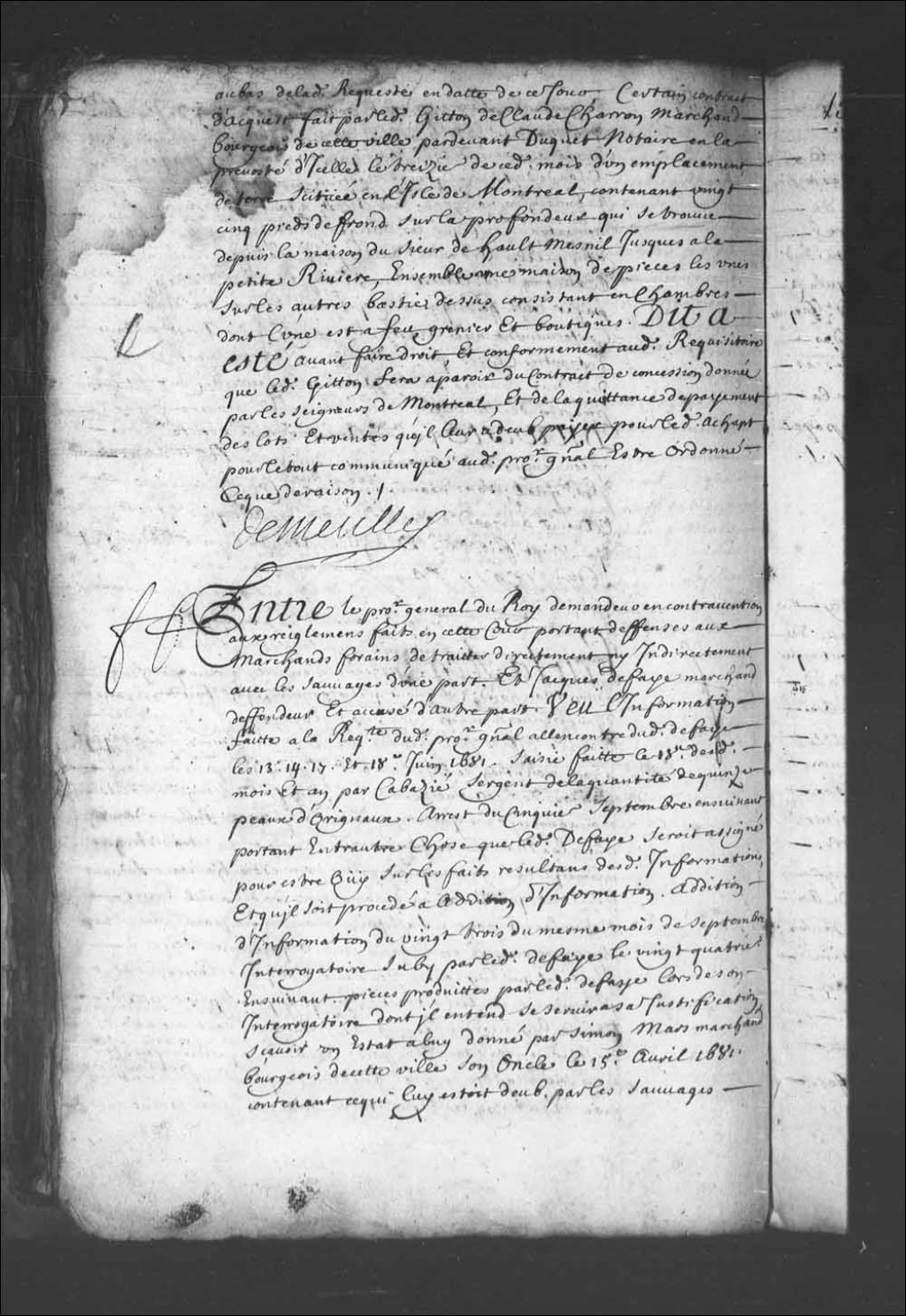 - Transcription du texte avec orthographe modernisée : «Entre le procureur général du Roi demandeur en contravention aux règlements faits en cette Cour portant défenses aux marchands forains de traiter directement ni indirectement avec les Sauvages d'une part. Et Jacques DEFAYE marchand défendeur et accusé d'autre part. Vu l'information faite à la requête dudit procureur général à l'encontre dudit Defaye les 13. 14. 17 et 18e juin 1681 saisie faite le 18e desdits mois et an par Cabazié sergent de la quantité de quinze peaux d'orignaux. Arrêt du cinquième septembre ensuivant portant entre autre chose que ledit Defaye serait assigné pour être ouï sur les faits résultant desdites informations et qu'il soit procédé à addition d'information. Addition d'information du vingt-trois du même mois de septembre. Interrogatoire subi par ledit Defaye le vingt-quatrième ensuivant. pièces produites par ledit Defaye lors de son interrogatoire dont il entend se servir à sa justification savoir un état à lui donné par Simon Mars marchand bourgeois de cette ville son Oncle le 15e avril 1681 contenant ce qui lui était dû par les Sauvages et par les Français, avec pouvoir de le recevoir, de vendre les marchandises qu'il avait à Montréal, et d'employer l'argent en pelleteries. Requête présentée à Monsieur Duchesneau pour lors intendant de ce pays par ledit Mars pour être maintenu dans la permission de traiter avec les Sauvages ladite requête entérinée par l'ordonnance de mondit sieur Duchesneau étant au bas en date du vingt-neuvième juillet audit an, après avoir par ledit Mars affirmé par serment que lesdites marchandises lui appartenaient, et que ledit Defaye était son commis, congé pour passer en France et retourner accordé par Monsieur de Courcelle ci-devant gouverneur et lieutenant général en ce pays le dixième octobre 1671 audit Defaye dit alors La Minoye, avec la qualité d'habitant du fief de L'oubie; ledit congé certifié par mondit sieur Duchesneau le 17e décembre 1680. Requête dudit Defaye présentée en cette Cour le 26e octobre 1681 à ce qu'il fût dit pour les causes et moyens qu'il expose par icelle qu'il avait pu jouir par le passé et qu'il pourra jouir dorénavant de la liberté du commerce avec les Français et avec les Sauvages sans qu'il y puisse être troublé en gardant les règlements faits en cette Cour, réquisitoire dudit procureur général étant ensuite de ladite requête en date du Lendemain, interrogatoires subis par ledit Simon Mars et Jean Defaye Châteauneuf les 7e septembre 1682. Et sixième de ce mois. Requête de Charles de Couagne présentée à mondit sieur Duchesneau pour avoir mainlevée desdits quinze peaux d'orignaux saisies alléguant avoir été achetées de son argent pour ledit Jacques Defaye, ladite requête par mondit sieur Duchesneau référée en cette Cour; requête présentée en cette Cour par ledit Jacques Defaye portant avoir acheté de Jean Toupin une maison située à la basse-ville de Québec par contrat en date du huitième juillet 1681. Conclusions dudit procureur général, en date du douzième du présent mois. Requête ce jourd'hui présentée en cette dit Cour par ledit Jean Defaye Châteauneuf au nom et comme fondé de procuration, et faisant les affaires en ce pays dudit Jacques Defaye son Cousin; à ce qu'il plût à cette dite Cour prononcer sur la susdites requête; et en ce faisant le déclarer habitant, et jouissant des privilèges des autres habitants de ce pays. Le rapport de maître Claude de Bermen de la Martinière conseiller tout considéré. Le Conseil faisant droit sur ladite requête dudit de Couagne, lui a donné et accordé mainlevée des quinze peaux d'orignaux saisies, et entérinant celles dudit Jacques Defaye, la Cour lui a permis et permet de jouir des privilèges des autres habitants de ce pays; et pour les cas résultant du procès l'a condamné et condamne en la somme de cinquante livres qui sera employée à payer les frais et dépens qui ont été faits contre lui. DEMEULLE.»