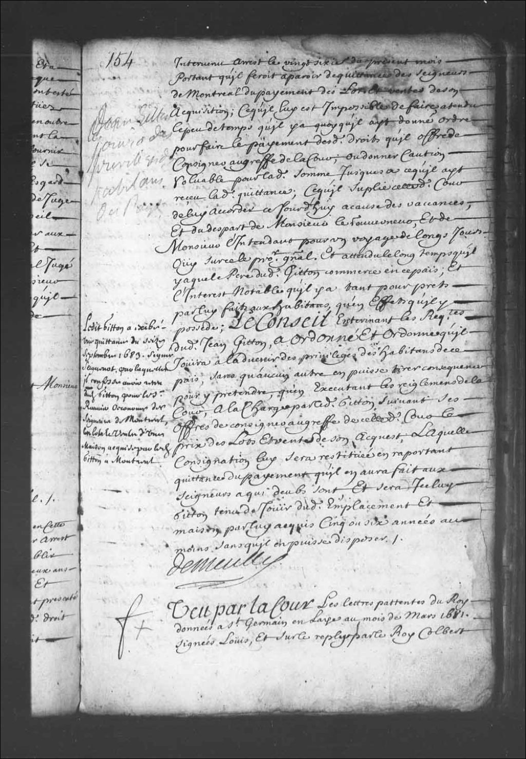 - Transcription du texte avec orthographe modernisée : «Vu par la Cour les lettres patentes du Roi données à Saint-Germain en Laie au mois de mars 1681 signées Louis, et sur le repli par le Roi Colbert et à côté est écrit visa le Tellier pour érection de baronnie, et scellées du grand sceau en cire verte sur laque de soie rouge et verte, par lesquelles et pour les causes y contenues sa Majesté crée, érige, élue et décore la terre et seigneurie de Portneuf située en ce pays en titre, nom et dignité de baronnie, pour en jouir par René Robineau écuyer sieur de Becancour chevalier de l'ordre de Saint-Michel grand voyer de ce pays, ses enfant, successeurs, ayant cause et les descendants d'iceux en légitime mariage pleinement et paisiblement, relevant de sa Majesté à une seule foi et hommage, aveu et dénombrement requis par les lois du royaume, et coutume, audit titre, nom et dignité de baronnie, sa Majesté voulant qu'ils se puissent dire, nommer et qualifier tels en tous actes tant en jugement que dehors qu'ils jouissent des droits d'armes, blasons, honneurs, prérogatives, rang, prééminences en fait de guerre, assemblées de noblesse, et autres, ainsi que les autres barons du royaume, que les vassaux, arrière vassaux, et autres tenant et relevant de ladite seigneurie de Portneuf noblement et en roture les reconnaissent pour barons, leur rendent leurs aveux, dénombrements et déclarations le cas y échéant en ladite qualité; laquelle sa Majesté veut pareillement être insérée dans les sentences qui seront rendues par leurs officiers en l'administration de la justice sur lesdits vassaux et justiciables, le tout en la susdite qualité de baronnie de Portneuf, sans néanmoins que lesdits vassaux soient tenus à cause du contenu aux dites patentes a autres plus grands droits ni devoirs que ceux qu'ils devaient alors, aucun changement de ressort ni contrevenir aux cas royaux; et par plus ample grâce et autorité; sa dite Majesté permet et octroie audit sieur de Becancour et ceux de sa famille d'ajouter dans leurs armes et celles de leurs ancêtres qui sont d'azur à la Cotisse d'Or accompagnée de six étoiles de même une fleur de lys posée sur une face de gueule, et ainsi qu'il est contenu aux dites lettres adressées en cette Cour pour être registrées, et du contenu en icelles jouir et user par ledit sieur de Becancour ses enfants postérité et lignée, successeurs et ayant cause, pleinement paisiblement et perpétuellement, cessant et faisant cesser tous troubles et empêchements contraires. Requête présentée en cette Cour par ledit sieur de Becancour afin dudit enregistrement pour jouir par lui de l'effet desdites lettres, au bas de laquelle est le soit montré au procureur général. Conclusions dudit procureur général datées de ce jour, le rapport de maître Louis Rouer de Villeray premier conseiller tout considéré et sur ce délibéré. Dit a été que lesdites lettres patentes de sa Majesté portant érection de la seigneurie de Portneuf en titre de baronnie en faveur dudit sieur de Becancour postérité et lignée, seront registrées au greffe de cette Cour pour par ledit sieur de Becancour ses enfants successeurs ayant cause et les descendants d'iceux en légitime mariage jouir pleinement et paisiblement du contenu, et aux conditions portées par icelles. DEMEULLE.»