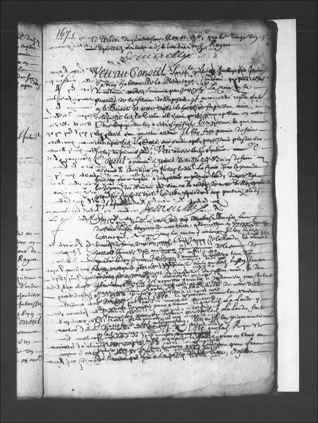 - Transcription du texte avec orthographe modernisée : «Vu au Conseil la requête présentée en icelui par Julien Boicy habitant de Ladurantays, contenant que pour raison de certains excès commis par Joseph LaCroix en la personne de la femme de l'exposant, il aurait été rendu sentence en la prévôté de cette ville le huitième du présent mois de laquelle ledit LaCroix se serait porté pour appelant en cette Cour lorsqu'elle lui a été signifiée l'onzième, et que comme les glaces sont prêtes à venir il lui fut permis de faire anticiper ledit LACROIX sur sondit appel, pour venir plaider sur icelui an premier jour, vu aussi ladite sentence. Le Conseil a permis et permet audit Julien Boicy de faire assigner et anticiper en icelui ledit LaCroix par le premier huissier sur ce requis à comparaître au premier lundi d'après le départ des navires qui sont à la rade de cette ville pour procéder sur ledit appel et être fait droit aux parties ainsi qu'il [...]