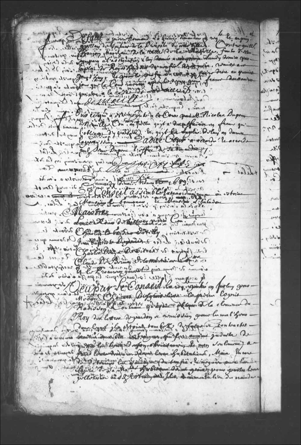Transcription du texte avec orthographe modernisée : «Sur ce qui a été représenté à la Cour par maître Nicolas Dupont de Neuville conseiller en icelle qu'il a des affaires en France qui l'obligent d'y passer, et qu'il la supplie de lui en donner la permission. Ladite Cour a accordé et accorde audit sieur Dupont l'effet de sa demande. DEMEULLE.»