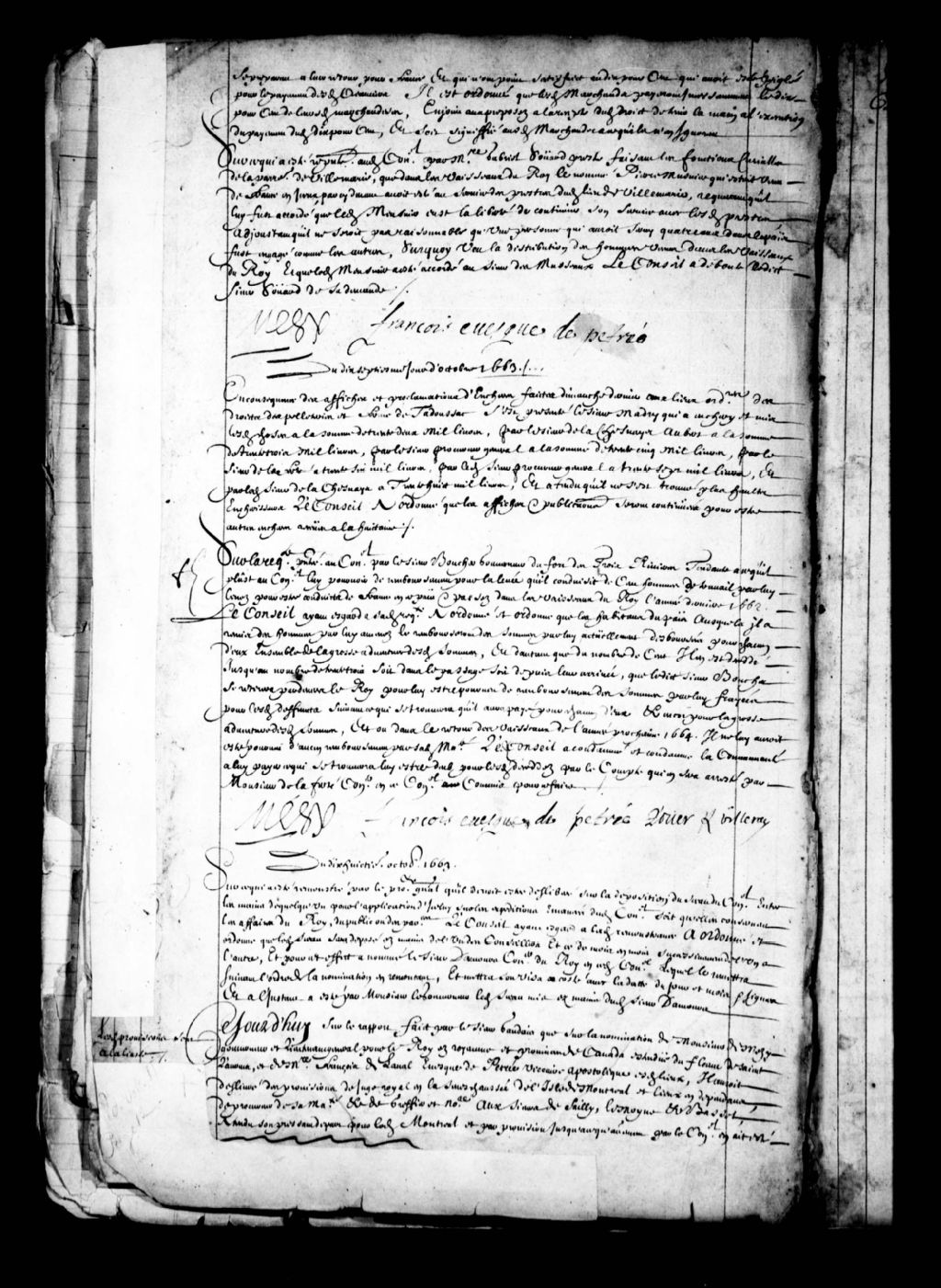 - Arrêt confirmant la nomination faite par le sieur de Mézy, gouverneur et lieutenant général du Roi et François de Laval, Évêque de Petrée, vicaire apostolique, aux sieurs de Sailly, Lemoine (Lemoyne) et Basset aux charges de juge royal, procureur du roi et greffier de la Sénéchaussée de l'île de Montréal, conformément à l'Édit d'établissement du Conseil souverain de la Nouvelle-France