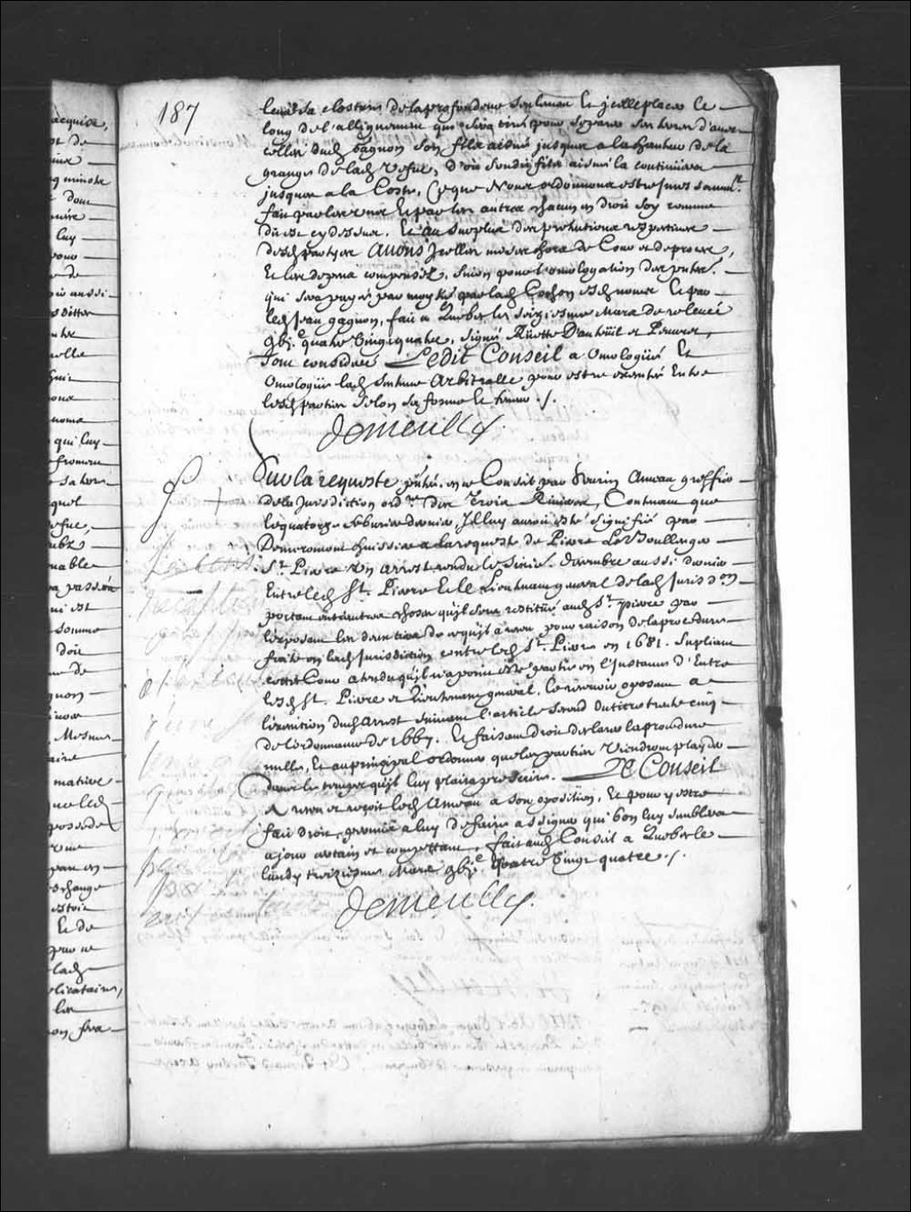 Transcription du texte avec orthographe modernisée : «Sur la requête présentée en ce Conseil par Sévérin Ameau greffier de la juridiction ordinaire des Trois-Rivières, contenant que le quatorze février dernier, il lui aurait été signifié par Demeromont huissier à la requête de Pierre Le Boullenger Saint-Pierre en arrêt rendu le sixième décembre aussi dernier entre ledit Saint-Pierre et le lieutenant général de la juridiction portant entre autres choses qu'il sera restitué audit Saint-Pierre par l'exposant les deux tiers de ce qu'il a reçu pour raison de la procédure faite en ladite juridiction contre ledit Saint-Pierre en 1681 suppliant cette Cour attendu qu'il n'a point été partie en l'instance d'entre lesdits Saint-Pierre et lieutenant général, le recevoir opposant à l'exécution dudit arrêt suivant l'article second du titre trente-cinq de l'ordonnance de 1667. Et faisant droit déclarer la procédure nulle, et au principal ordonner que les parties viendront plaider dans le temps qu'il lui plaira prescrire. Le Conseil a reçu et reçoit ledit Ameau à son opposition, et pour y être fait droit, permis à lui de faire assigner qui bon lui semblera à jour certain et compétent, fait audit Conseil à Québec le lundi treizième mars mille six cent quatre-vingt-quatre. DEMEULLE.»
