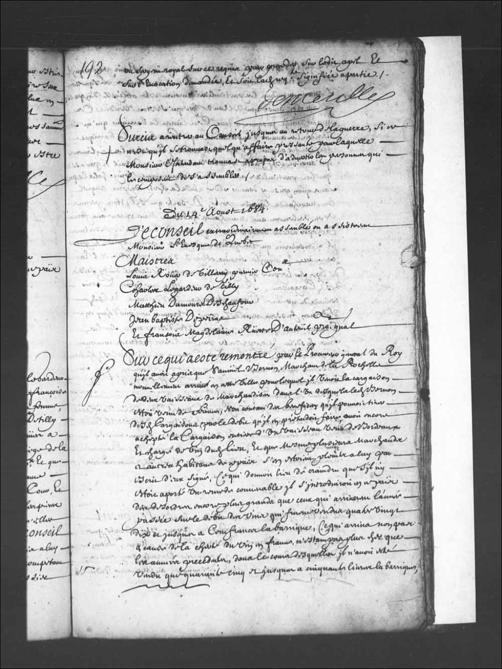 Transcription du texte avec orthographe modernisée : «Du 14e août 1684. Le Conseil extraordinairement assemblé où assistaient Monsieur l'évêque de Québec. Maîtres. Louis Rouer de Villeray premier conseiller. Charles Legardeur de Tilly. Mathieu Damours Deschaufour. Jean-Baptiste Depeiras. Et François Madeleine Ruette d'Auteuil procureur général. Sur ce qui a été remontré par le procureur général du Roi qu'il avait appris que Samuel Bernon marchand de La Rochelle nouvellement arrivé en cette ville pour lequel il venait la cargaison de deux vaisseaux de marchandises dans l'un desquels ledit Bernon était venu de France, non content des bénéfices qu'il pouvait tirer desdites cargaisons par le débit qu'il en prétendait faire, avait encore acheté la cargaison entière d'un vaisseau venu de Bordeaux et chargé de vin dudit lieu, et que même plusieurs marchands et autres habitants de ce pays s'en étaient Plaints à lui par écrit d'eux signé, ce qui [...]