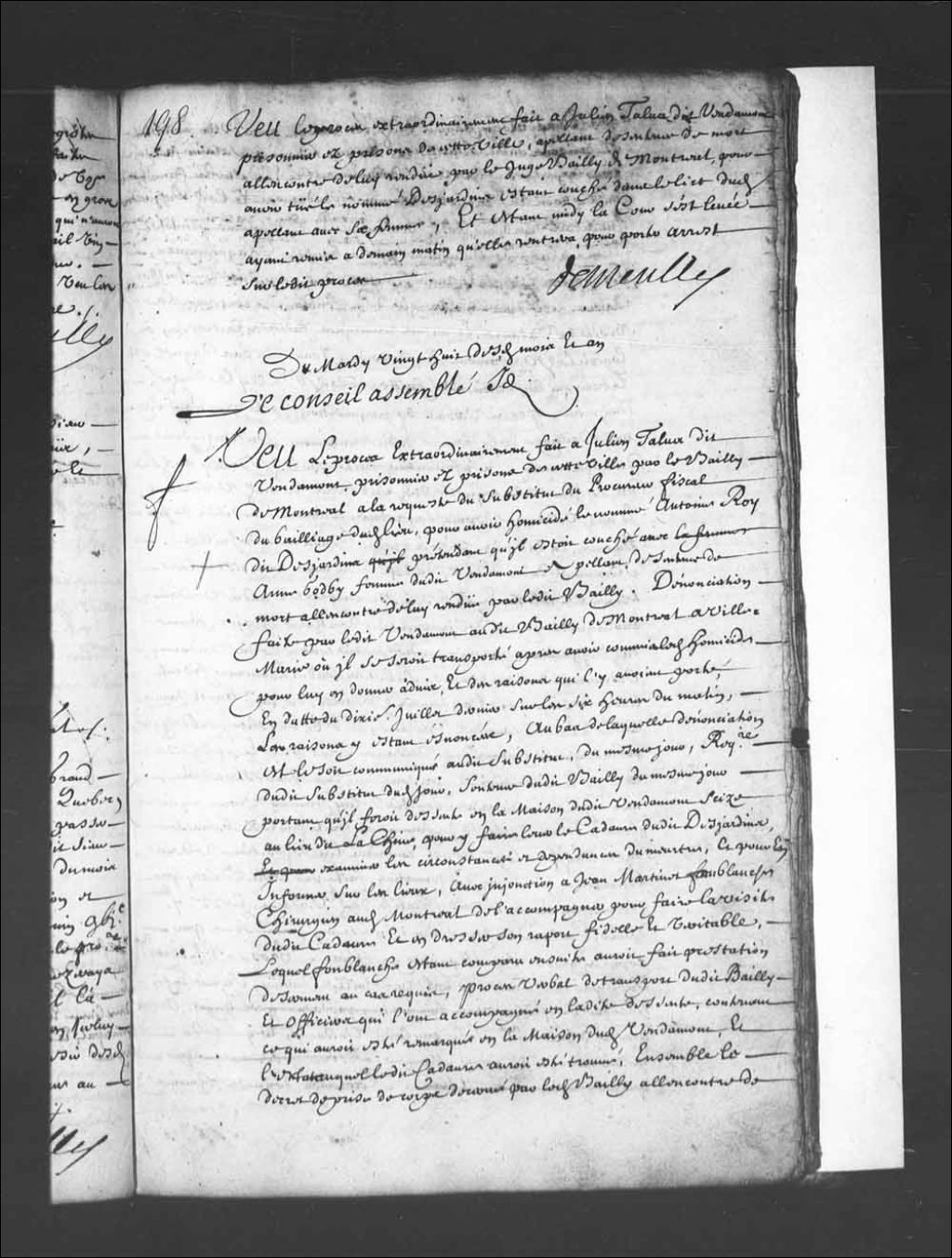 - Transcription du texte avec orthographe modernisée : «Vu le procès extraordinairement fait à Julien Talua dit Vendamont prisonnier des prisons de cette ville, appelant de sentence de mort à l'encontre de lui rendue par le juge bailli de Montréal, pour avoir tué le nommé Desjardins étant couché dans le lit dudit appelant avec sa femme, et étant midi la Cour s'est levée ayant remis à demain matin qu'elle rentrera, pour porter arrêt sur ledit procès. DEMEULLE. Du mardi vingt-huit desdits mois et an. Le Conseil assemblé idem. Vu le procès extraordinairement fait à Julien Talua dit Vendamont, prisonnier des prisons de cette ville par le bailli de Montréal à la requête du substitut du procureur fiscal du bailliage dudit lieu, pour avoir homicidé le nommé Antoine Roy dit Desjardins prétendant qu'il était couché avec Anne Godby femme dudit Vendamont appelant de sentence de mort à l'encontre de lui rendue par ledit bailli. Dénonciation faite par ledit Vendamont audit bailli de Montréal à Ville-Marie où il se serait transporté après avoir commis ledit homicide pour lui en donner avis, et des raisons qui l'y avaient porté, en date du dixième juillet dernier sur les six heures du matin, les raisons y étant énoncées, au bas de laquelle dénonciation est le soit communiqué audit substitut, du même jour, registre dudit substitut dudit jour, sentence dudit Bailli du même jour portant qu'il ferait descente en la maison dudit Vendamont sise au lieu dit Lachine, pour y faire lever le cadavre dudit Desjardins, examiner les circonstance et dépendances du meurtre, et pour en informer, sur les lieux, avec injonction à Jean Martinet Fonblanche chirurgien audit Montréal de l'accompagner pour faire la visite dudit cadavre et en dresser son rapport fidèle et véritable, lequel Fonblanche étant comparu ensuite aurait fait prestation de serment au cas requis, procès-verbal de transport dudit Bailli et officiers qui l'ont accompagné en ladite descente, contenant ce qui aurait été remarqué en la maison dudit Vendamont, et l'état auquel ledit cadavre aurait été trouvé, ensemble le décret de prise de corps décerné par ledit Bailli à l'encontre de ladite Anne Godby femme dudit Vendamont pour être conduite des prisons dudit bailliage, et que témoins seraient assignés pour déposer sur la vérité dudit meurtre, et sur la familiarité qu'il y avait eue entre ladite femme Vendamont et ledit Desjardins, inventaire des biens desdits Vendamont et desjardins, annotés et mis à la garde du nommé Pierre Gaultier Chagouingara, lesdits procès-verbal et inventaire datés dudit jour dixième juillet dernier. Rapport en chirurgie dudit Fonblanche contenant la visite du cadavre, et autres remarques faites en la maison où logeait ledit Vendamont, en date dudit jour, au bas duquel est la taxe qui lui aurait été faite par ledit Bailli le douzième dudit mois, procès-verbal de perquisition faite par Lory sergent audit bailliage de la femme dudit Vendamont, du onzième du même mois. Information faite par ledit bailli audit lieu dit Lachine à la requête dudit substitut et dudit Vendamont, et audit Ville-Marie depuis son retour, contenant l'audition de six témoins en date des onze et treizième dudit mois de juillet. Ordonnance dudit bailli du 24e dudit mois, pour être les témoins récolés, et si besoin est confrontés audit Vendamont, par laquelle appert de l'intervention de Marie Major femme dudit desjardins, pour se rendre partie contre ledit Vendamon, ordonnance de Jean Gervaise substitut dudit procureur fiscal tenant le siège pour l'absence dudit bailli, du 29e août dernier, rendue à la diligence dudit Vendamon et d'un substitut subdélégué portant que la femme dudit Vendamon serait prise et appréhendée au corps et constituée des prisons dudit lieu pour être adroit, avec défenses audit Pierre Gaultier de lui fournir vivres ni autre chose. Continuation d'information faite par ledit Gervaise datée dudit jour 29e août contenant les dépositions de deux témoins. Addition d'information faite par ledit bailli par atténuation aux faits justificatifs dudit Vendamon. Le 22e septembre dernier, contenant la déposition d'un témoin. Le tout par copie en grosse signée Maugue greffier. Grosse d'interrogatoire subi par ladite Anne Godby l'onze juillet dernier, signée enfin Maugue greffier. Autre grosse d'interrogatoire subi par ledit Vendamon le quinze du même mois, aussi signé Maugue. Récolement de quatre témoins en leurs dépositions contenues lesdites informations, en date des 22 23. Et dernier septembre aussi signé Maugue, et fait par ledit bailli confrontation faite par ledit bailli de quelques témoins audit Vendamon, en date desdits jours 22. 23. Et dernier septembre, et cinquième octobre ensuivant, au bas de laquelle est l'ordonnance dudit bailli portant le soit communiqué audit substitut, avec tout le procès, en date du même jour, signé Maugue. Répétition d'interrogatoire faite audit Vendamon ledit jour 22 septembre, au bas duquel est le soit communiqué audit substitut et par ses mains à partie civile, signée Maugue. Conclusions définitives dudit Gervaise substitut en date du onze octobre dernier. Interrogatoire fait audit Vendamon sur la sellette par ledit bailli le quatorzième du même mois. Sentence de mort, rendue par ledit bailli contre ledit Vendamon le même jour quatorze octobre, et ses biens acquis et confisqués à qui il appartiendra et ladite Anne Godby sa femme condamnée, pour crime d'adultère commis avec ledit Desjardins, à un bannissement perpétuel de ladite île, à peine du fouet et du carcan en cas de contravention. à la prononciation de laquelle sentence ledit Vendamon en aurait interjeté appel en cette Cour, ainsi que ledit substitut, suivant le procès-verbal dudit bailli contenant son ordonnance audit greffier de travailler incessamment aux grosses du procès, pour être amené par la première barque avec