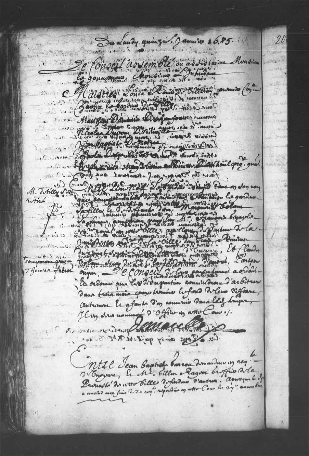- Transcription du texte avec orthographe modernisée : «Entre Jean-Baptiste GARROS demandeur en requête d'une part, et maître Gilles RAGEOT greffier de la prévôté de cette ville défendeur d'autre. Après que le demandeur a conclu aux fins de sa requête répondue en cette Cour le 27e novembre dernier, à ce que pour les causes y contenues et vu l'arrêt du cinquième septembre 1681, à ce que le défendeur soit condamné même par corps, lui remettre incessamment entre les mains la somme de cent vingt-neuf livres, à compte de ce qui lui est dû par la succession du défunt François Perron vivant marchand demeurant en la ville de La Rochelle, sauf à se pourvoir pour le surplus, sur les autres biens de la succession vacante dudit Perron. Et que par ledit Rageot a été dit que la somme de quatorze cent cinquante livres procédante du prix d'une maison sise à la basse-ville vende par décret sur ladite succession et déposée entre ses mains a été entièrement consommé par les payements qu'il a été obligée de faire en exécution de jugement de Monsieur Bouteroue ci-devant intendant de justice en ce pays, de sentences du sieur Chartier ci-devant lieutenant général de la prévôté de cette ville de ses taxes et exécutoires, et d'ordonnances de Monsieur le comte de Frontenac ci-devant gouverneur et lieutenant général de ce dit pays, concluant à être renvoyé de l'action, avec dépens, le rapport du sieur Depeiras conseiller en cette Cour commissaire établi en cette partie par arrêt du 11e décembre dernier, et vu son procès-verbal du 18e dudit mois. La Cour a ordonné et ordonne que le demandeur se référera au serment du défendeur, attendu l'incendie, s'il ne juge plus à propos de justifier que ladite somme de cent vingt-neuf livres en question a été ci-devant allouée et passée au défendeur sur ce qui lui avait été mis en dépôt, auquel serment ledit demandeur s'est référé, et pris le serment au cas requis dudit Rageot, lequel a affirmé que ladite somme de cent vingt-neuf livres à lui demandée a été comprise dans ce qui lui a été passé en compte, et qu'il ne lui reste rien entre ses mains de ce qui lui avait été mis en dépôt ayant payé le tout suivant lesdits jugement, sentences, taxes, exécutoires et ordonnances, auxquelles il n'a pu ni dû contredire, et dont il aurait entièrement fait paraître en cette Cour, sans l'incendie de la basse-ville où il aurait perdu plusieurs papiers, et entre autres partie de ceux dudit décret, ladite Cour a déchargé et décharge ledit Rageot de l'action qui lui était faite en demande de ladite somme de cent vingt-neuf livres, sauf au demandeur de se pourvoir ainsi qu'il avisera sur les autres biens de la succession dudit défunt Perron, jusqu'à la concurrence de son dû, dépens compensés. DEMEULLE.»