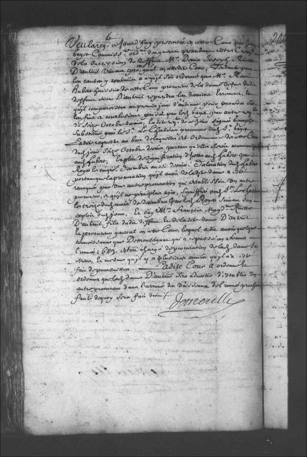 - Transcription du texte avec orthographe modernisée : «Vu la requête ce jourd'hui présentée en cette Cour par Jean Gayet commissaire ordinaire des guerres prétendant être créancier de la succession de défunt maître Denis Joseph Ruette d'Auteuil vivant procureur général en cette dite Cour, tendante pour les causes y contenues à ce qu'il soit ordonné que maître René Hubert huissier de cette Cour procureur de la dame veuve dudit défunt sieur d'Auteuil reprendra les derniers errements. Et qu'il comparaîtra au premier jour d'audience pour procéder sur les fins et conclusions prises par ledit Gayet par autre requête du seize octobre dernier, ladite requête de ce jour signée Genaple substitué par le sieur LeChasseur procureur dudit sieur Gayet ladite requête au bas de laquelle est ordonnance de cette Cour dudit jour seize octobre dernier portant qu'elle serait communiquée audit Hubert, exploit de signification d'icelle audit Hubert par Rouer le cinquième décembre aussi dernier. Déclaration dudit Hubert portant que la procuration qu'il avait de ladite dame a été révoquée par une autre procuration qui établissait un autre procureur, et qu'il ne peut plus agir, signifiée audit sieur Lechasseur le treize dudit mois de décembre par ledit Roger suivant son exploit dudit jour, et ouï maître François Madeleine Ruette d'Auteuil fils dudit défunt et de ladite dame d'Auteuil et procureur général en cette Cour, lequel a dit avoir quelques connaissances que de Monseignat qui a repassé en France l'année 1683 était chargé de procuration de ladite dame sa mère, et même qu'il y a plusieurs années qu'il n'a été fait de poursuites. Ladite Cour a ordonné et ordonne que ladite dame d'Auteuil sera avertie d'établir un autre procureur dans l'arrivée des vaisseaux de l'année prochaine, faute de quoi sera fait droit. DEMEULLE.»