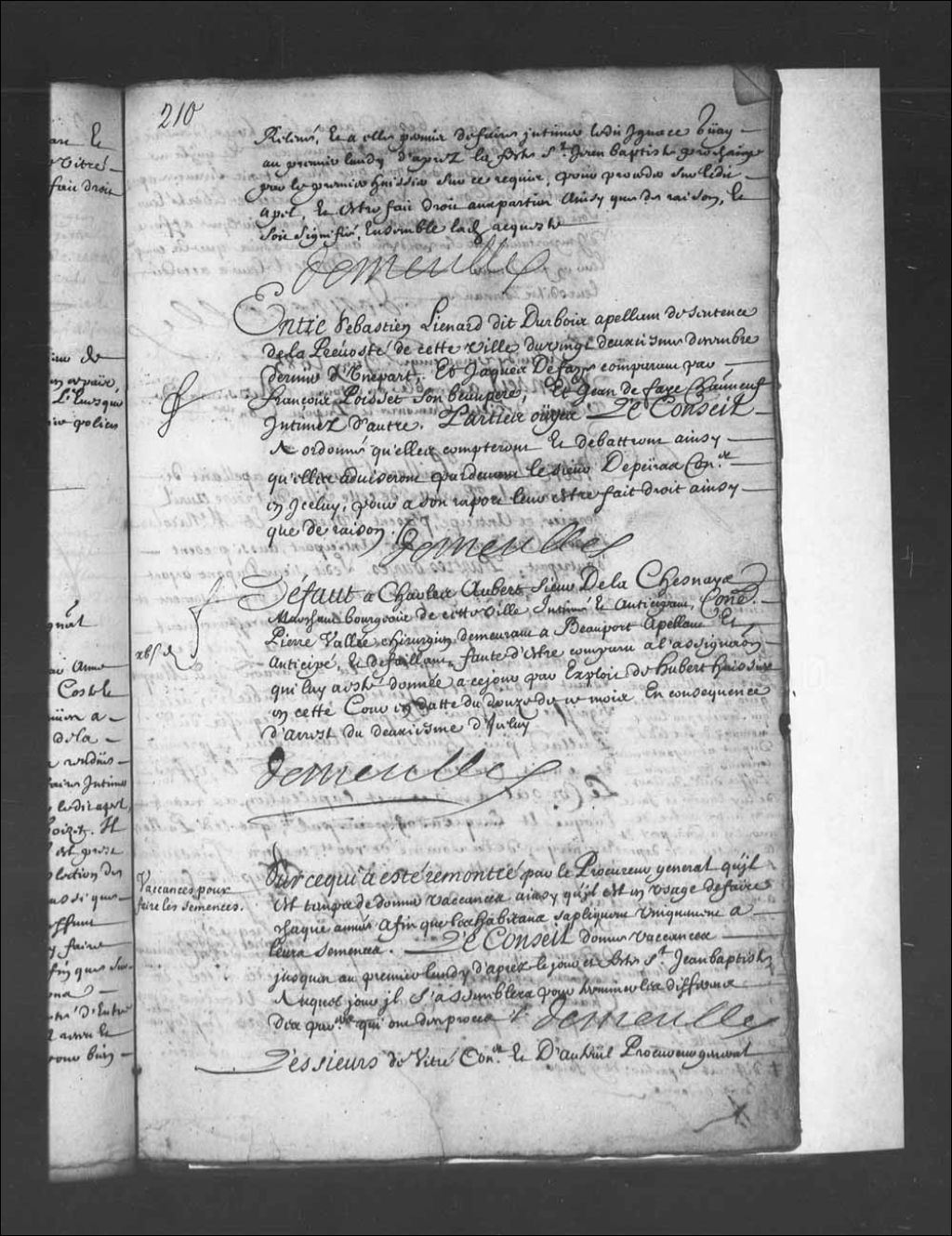 Transcription du texte avec orthographe modernisée : «Entre Sébastien LIENARD dit DURBOIS appelant de sentence de la prévôté de cette ville du vingt-deuxième décembre dernier d'une part, et Jacques DEFAYE comparant par François Poisset son beau-père, et Jean Defaye Châteauneuf intimés d'autre. Parties ouïes, le Conseil a ordonné qu'elles compteront et débattront ainsi qu'elles aviseront par-devant le sieur Depeiras conseiller en icelui, pour à son rapport leur être fait droit ainsi que de raison. DEMEULLE.»