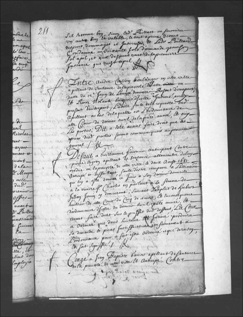 Transcription du texte avec orthographe modernisée : «Défaut à Guillaume Fournier anticipant contre Pierre Aigron appelant de sentence à l'encontre de lui rendue en la prévôté de cette ville le deux août 1681 anticipé et défaillant faute d'être comparu a l'assignation qui lui a été donnée ce jour à son dernier domicile à la rivière Saint-Charles en parlant à la femme de Julien Jouin y demeurant, suivant l'exploit de Hubert huissier de cette Cour du cinq de ce mois, et en conséquence d'ordonnance d'icelle du dernier avril présente année, et avant faire droit sur le profit dudit défaut, la Cour a ordonné que dans huitaine ledit intimé produira sa demande et pièces justificatives conformément à l'ordonnance pour ce fait être ordonné ce que de raison, et soit signifié. R. V.»