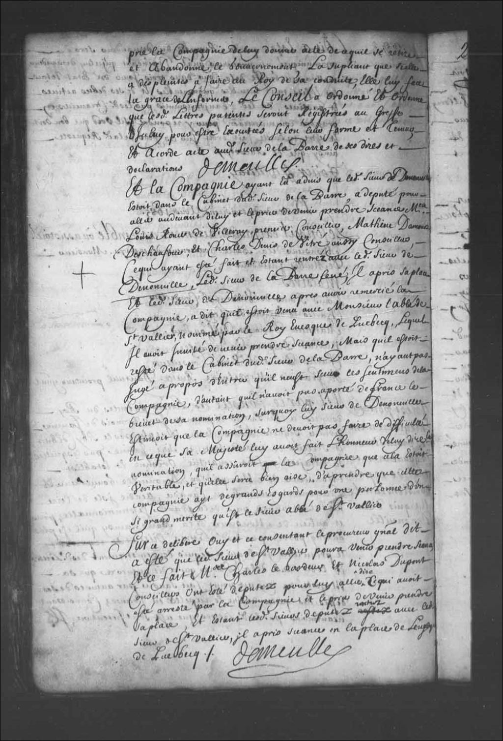 Transcription du texte avec orthographe modernisée : « et ledit sieur de Denonville après avoir remercié la Compagnie, a dit qu'il était venu avec Monsieur l'abbé de Saint-Vallier, nommé par le Roi évêque de Québec, lequel il avait invité de venir prendre séance, mais qu'il était resté dans le cabinet dudit sieur de Labarre, n'ayant pas jugé à propos d'entrer qu'il n'eût su les sentiments de la compagnie, d'autant qu'il n'avait pas apporté de France le brevet de sa nomination, sur quoi lui sieur de Denonville estimait que la compagnie ne devait pas faire de difficulté en ce que sa Majesté lui avait fait l'honneur de lui dire la nomination, qu'il assurait la compagnie que cela était véritable, et qu'elle sera bien aise, d'à prendre que cette compagnie ait de grands égards pour une personne d'un si grand mérite qu'est le sieur abbé de Saint-Vallier.»