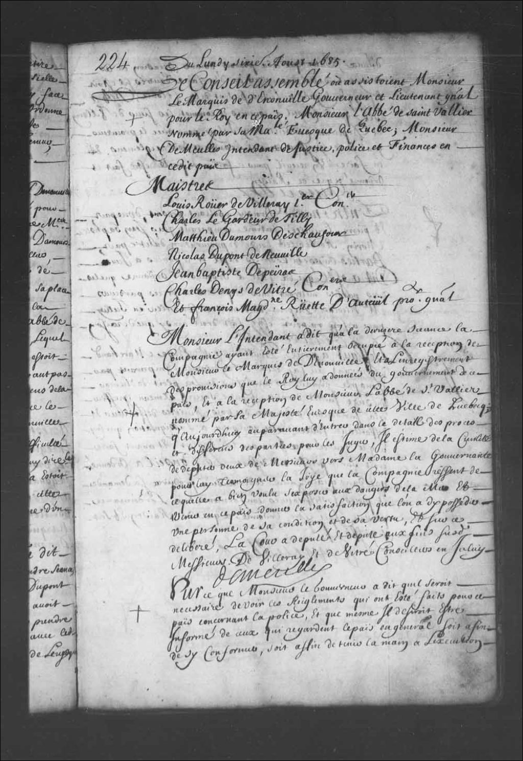 Transcription du texte avec orthographe modernisée : «Du lundi sixième août 1685. Le Conseil assemblé où assistaient Monsieur le marquis de Denonville gouverneur et lieutenant général pour le Roi en ce pays. Monsieur l'abbé de Saint-Vallier nommé par sa Majesté évêque de Québec; Monsieur DeMeulles intendant de justice, police et finances en ce dit pays. Maîtres. Louis Rouer de Villeray premier conseiller. Charles Legardeur de Tilly. Mathieu Damours Deschaufour. Nicolas Dupont de Neuville. Jean-Baptiste Depeiras. Charles Denys de Vitré conseillers. Et François Madeleine Ruette d'Auteuil procureur général. Monsieur l'intendant a dit qu'à la dernière séance la compagnie ayant été entièrement occupée à la réception de Monsieur le marquis de Denonville et à l'enregistrement des provisions que le Roi lui a données du gouvernement de ce pays, et à la réception de Monsieur l'abbé de Saint-Vallier nommé par sa Majesté évêque de cette ville de