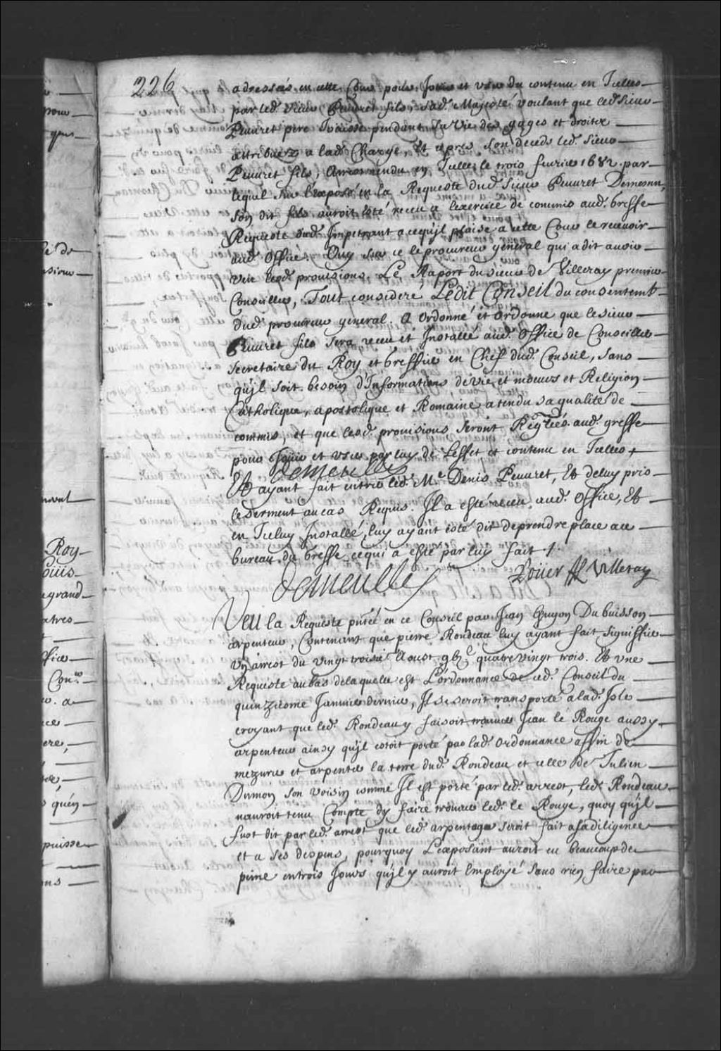 - Transcription du texte avec orthographe modernisée : «Vu la requête présentée en ce Conseil par Jean Guyon Dubuisson arpenteur, contenant que Pierre Rondeau lui ayant fait signifier un arrêt du vingt-troisième août mille six cent quatre-vingt-trois. Et une requête au bas de laquelle est l'ordonnance de ce dit Conseil du quinzième janvier dernier, il se serait transporté à ladite île croyant que ledit Rondeau y faisait trouver Jean le rouge aussi arpenteur ainsi qu'il était porté par ladite ordonnance afin de mesurer et arpenter la terre dudit Rondeau et celle de Julien Dumon son voisin comme il est porté par ledit arrêt, ledit Rondeau n'aurait tenu compte d'y faire trouver ledit LeRouge, quoi qu'il fût dit par ledit arrêt que ledit arpentage serait fait à sa diligence et à ses dépens, pourquoi l'exposant aurait eu beaucoup de peine en trois jours qu'il y aurait employé sans rien faire par la faute dudit Rondeau comme dit est, et qu'il paraît par le procès-verbal dudit Guyon daté du huit mai dernier, suppliant la Cour lui décerner exécutoire de la somme de quinze livres sur ledit Rondeau, comme aussi de dix livres pour un autre voyage de deux jours qu'il fût obligé de faire sur ces dits lieux a même fin par ordonnance de Monsieur Duchesneau, et pour être venu du huitième juillet dernier en cette ville pour demander sa taxe et exécutoire ce qu'il plairait à cette Cour, et aussi afin d'être déchargé de l'obligation d'y plus retourner étant vieil et ne pouvant plus supporter de telles fatigues et incommodités que celles qu'il y a souffertes, au bas de laquelle requête est ordonnance de cette Cour du 9e juillet dernier le tout signifié audit Rondeau par Jacob huissier suivant son exploit du dernier dudit mois, avec assignation en cette dite Cour, vu aussi copie et signification faite audit Guyon à la requête dudit Rondeau d'arrêt du vingt-troisième août mille six cent quatre-vingt-trois par Metru huissier suivant son exploit du cinquième novembre ensuivant, signification aussi à lui faite par ledit Metru le vingtième mars dernier, de requête dudit Rondeau et d'ordonnance de cette Cour du quinzième janvier dernier, procès-verbal dudit Guyon du huit mai aussi dernier et un acte de comparution au greffe par ledit Guyon du vingtième de ce mois pour servir de faire entrer en taxe un autre voyage, dit a été que ledit Rondeau est condamné payer audit Guyon la somme de quinze livres pour le voyage par lui fait à ladite île de Saint-Laurent en exécution desdits arrêts et ordonnance de cette Cour, et trois livres pour la signification de l'ordonnance du 9e juillet dernier dont est exécutoire, sauf audit Rondeau son recours contre ledit Dumont si le cas y échoit. DEMEULLE.»