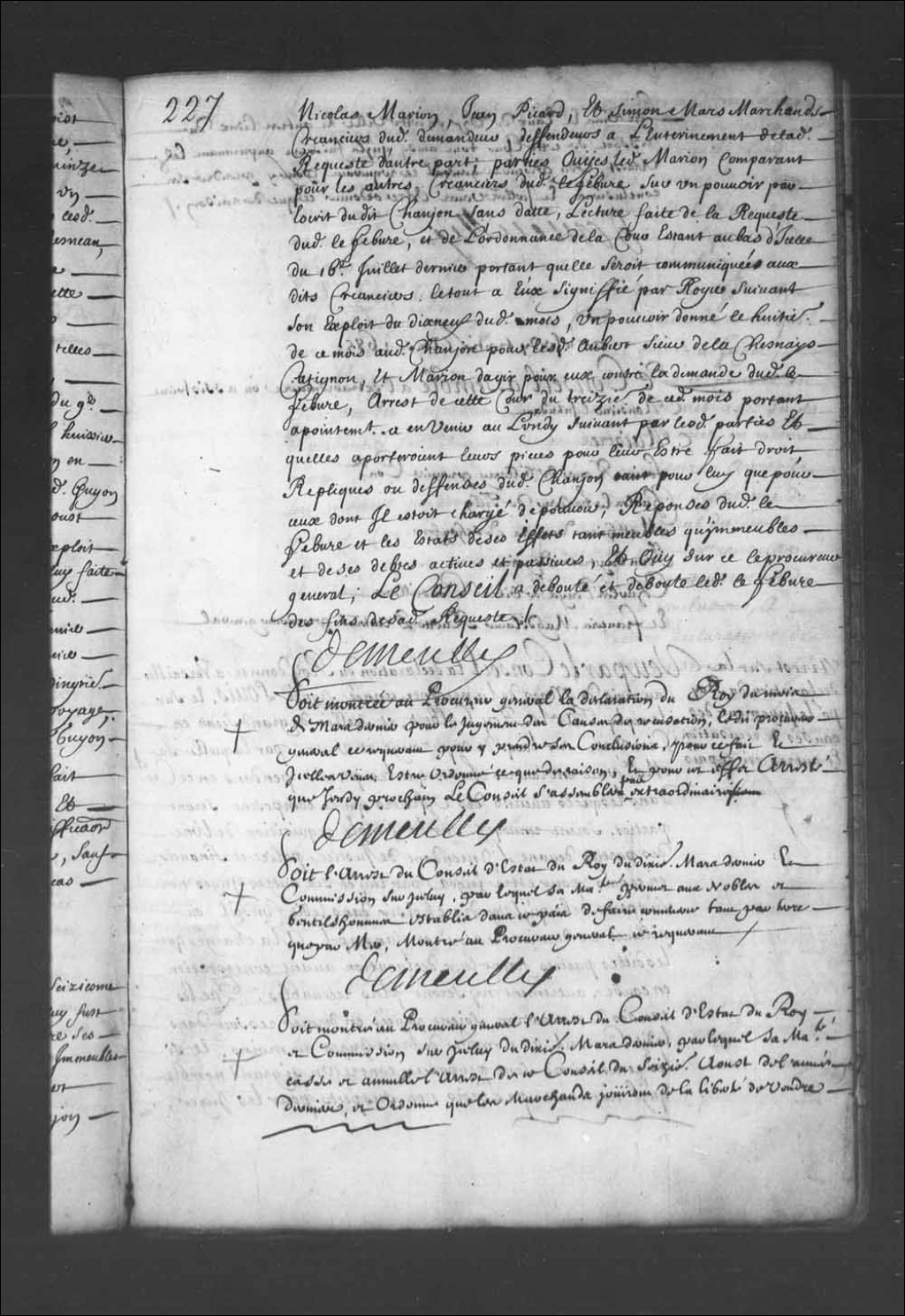 Transcription du texte avec orthographe modernisée : «Soit l'arrêt du Conseil d'état du Roi du dixième mars dernier et commission sur icelui, par lequel sa Majesté permet aux nobles et gentilhommes établis dans ce pays de faire commerce tant par terre que par mer, montré au procureur général ce requérant. DEMEULLE.»