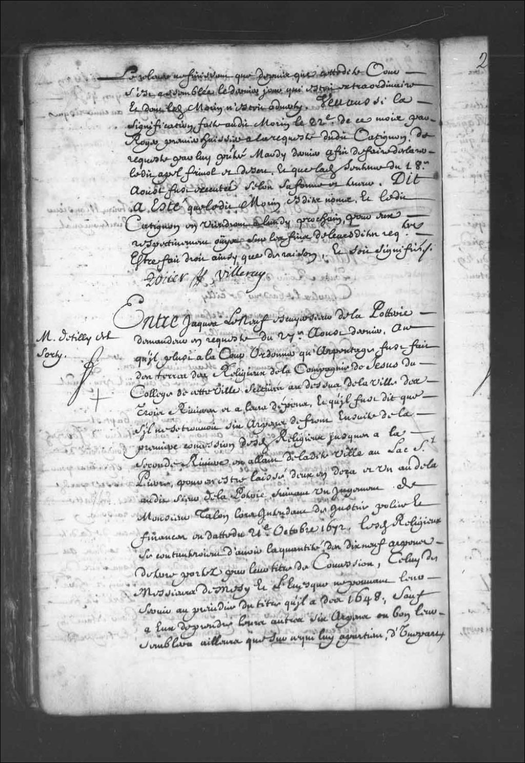 - Transcription du texte avec orthographe modernisée : «Monsieur de Tilly est sorti. Entre Jacques LENEUF écuyer sieur de LaPoterie demandeur en requête du 27e août dernier, à ce qu'il plût à la Cour ordonner qu'arpentage fut fait des terres des religieux de la compagnie de Jésus du collège de cette ville situées an dessus de la ville des Trois-Rivières et à leurs dépens, et qu'il fût dit que s'il ne se trouvait six arpents de front ensuite de la première concession desdits religieux jusqu'à la seconde Rivière en allant de ladite ville au Lac Saint-Pierre, pour en être laissé deux en deçà et un au-delà audit sieur de LaPoterie suivant un jugement de Monsieur Talon lors intendant de justice police et finances en date du 21e octobre 1672, lesdits religieux se contenteraient d'avoir la quantité des dix-neuf arpents de terre portés par leur titre de concession, celui de Messieurs de Mesy et l'évêque ne pouvant leur servir au préjudice du [...]